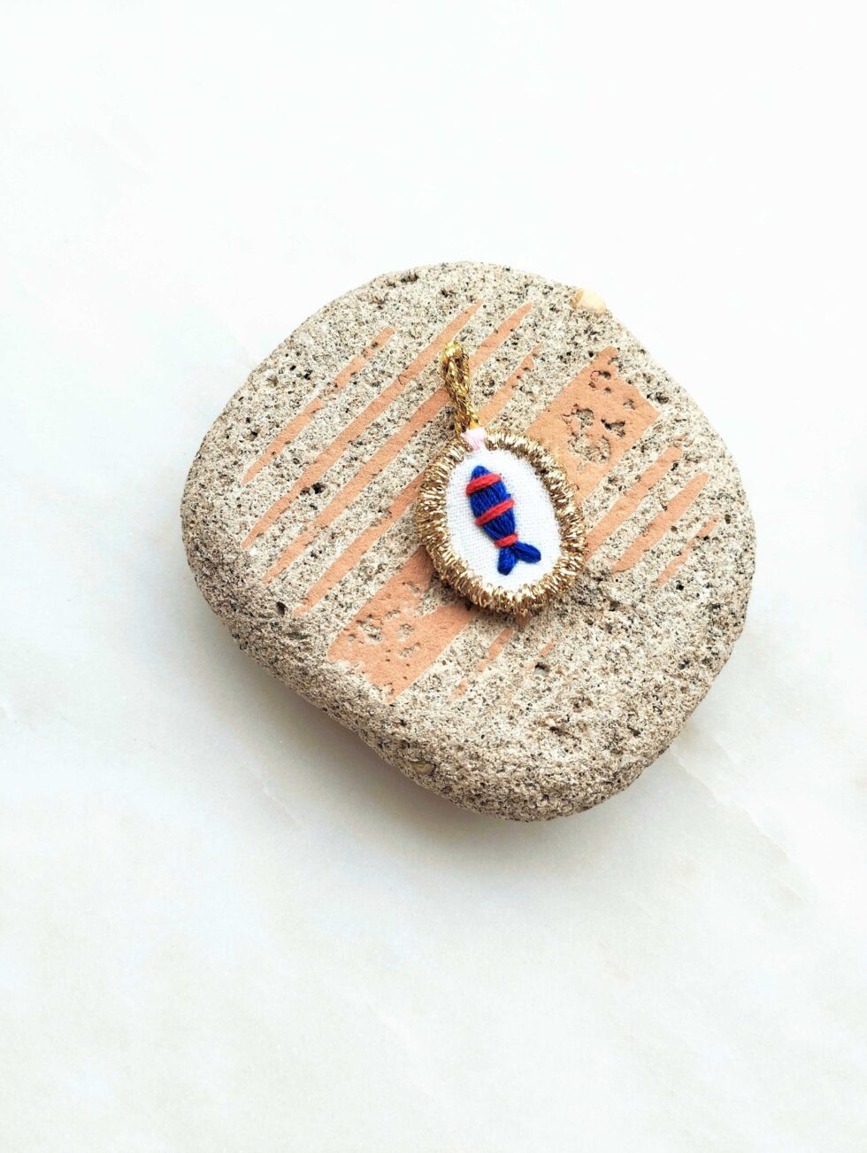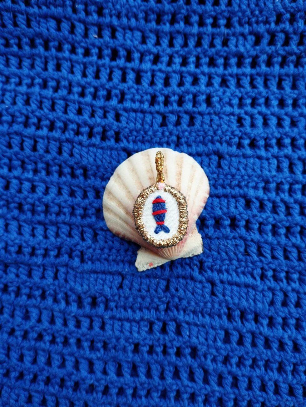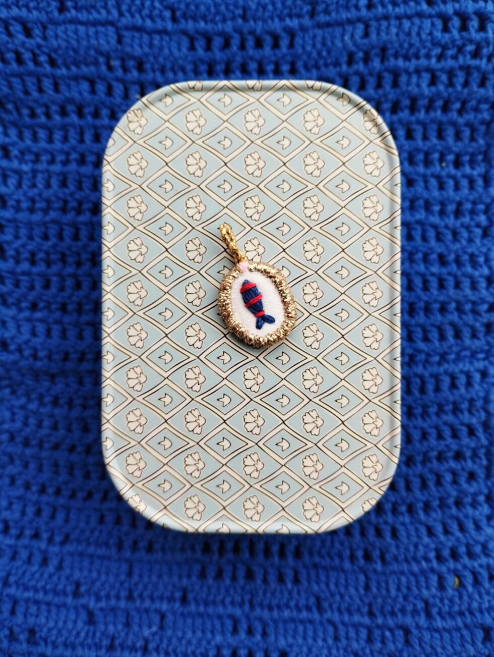 Foggia ovale con ricamo pesciolino blu con righine rosse.