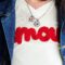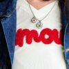 Sul lato: medaglietta tessile tonda più piccola rispetto al ciondolo principale, profilata in lurex e ricamata a motivo cuoricino in filato di cotone rosso su base di cotone color panna (cm 1,5 circa di diametro).