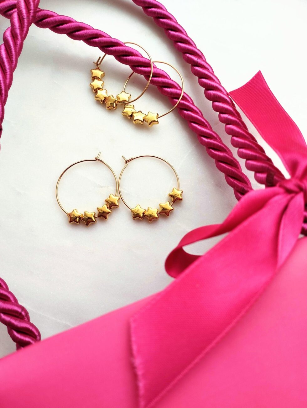 Eleganti e leggerissimi orecchini a cerchio in acciaio inossidabile e anallergico dorato (diametro del cerchietto: 2,5 cm circa) con stelline in ottone dorato.