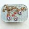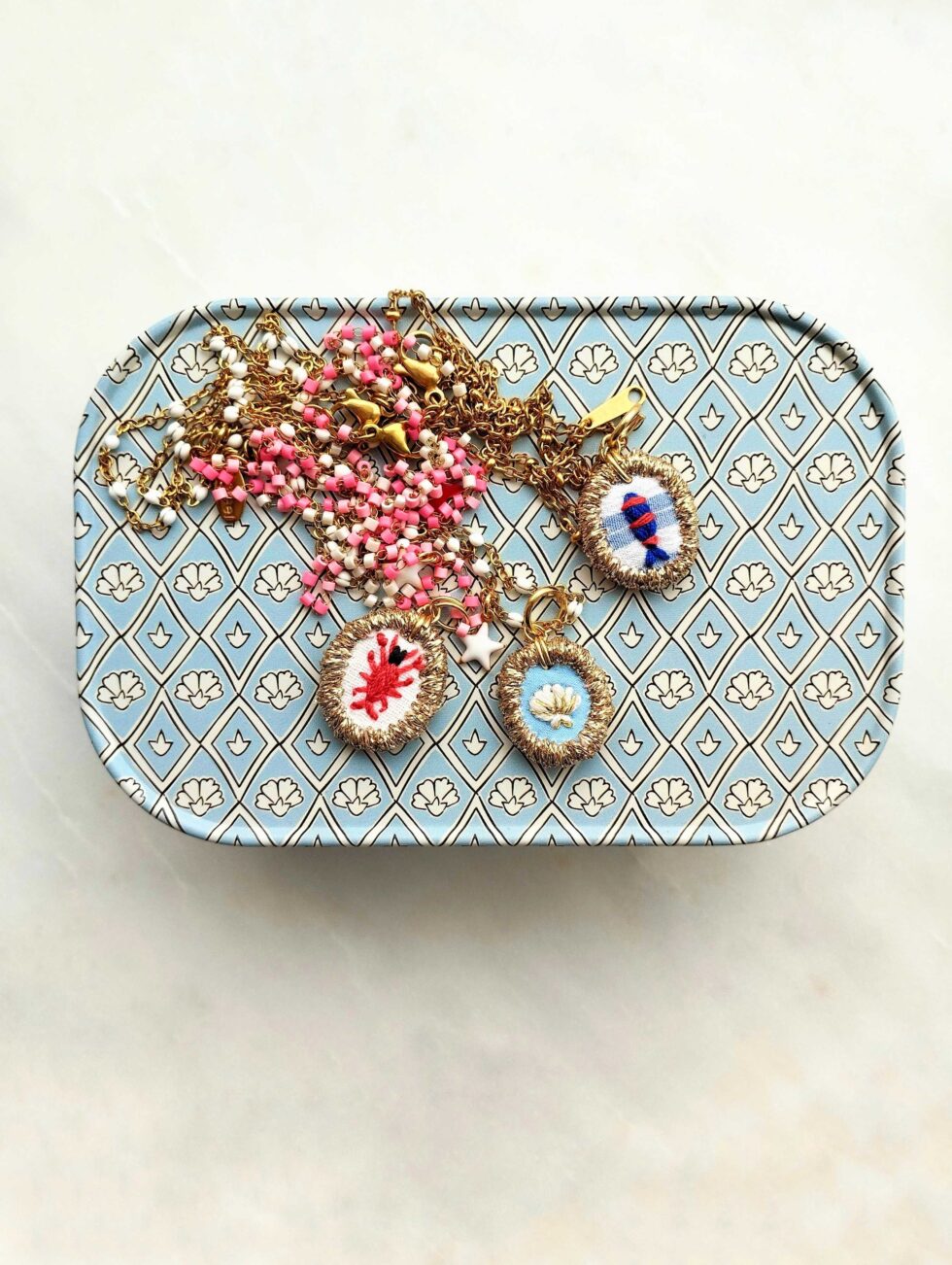 Micro charm a medaglietta tessile ovale profilata lurex e ricamata a motivo pesciolino a righe su base di cotone bianco panna e azzurro rigato (cm 1,8 circa di diametro).