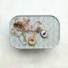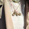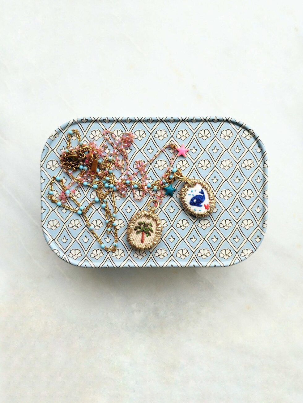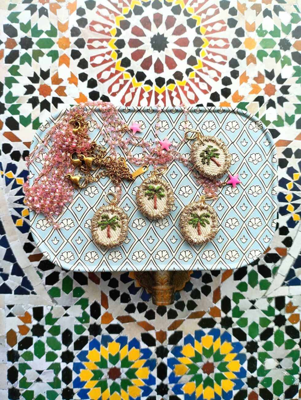 Micro charm a medaglietta tessile ovale profilata lurex e ricamata a motivo palma su base di cotone color panna (cm 1,8 circa di diametro).
