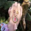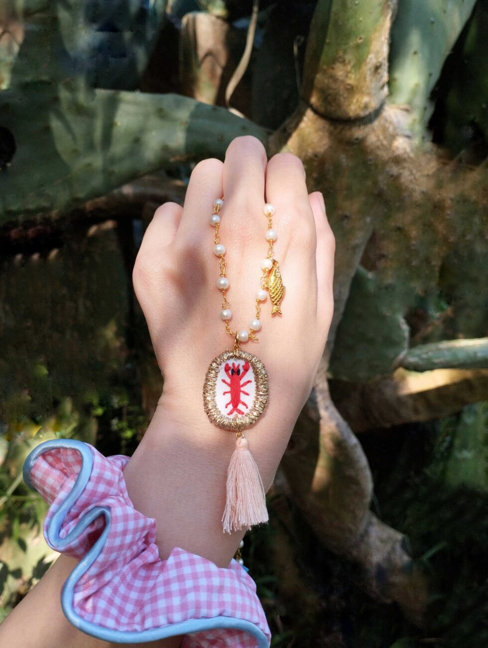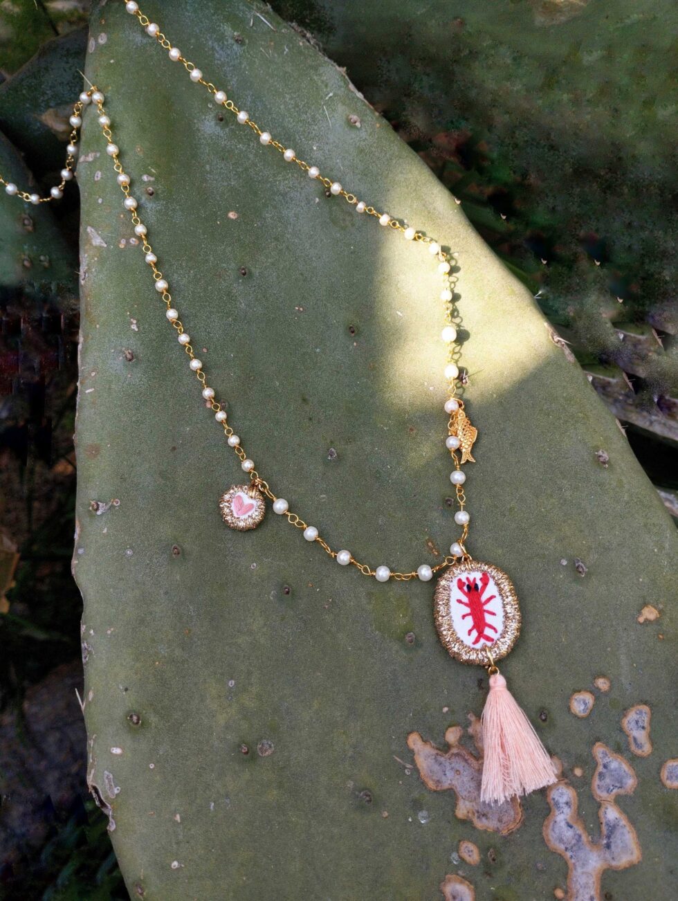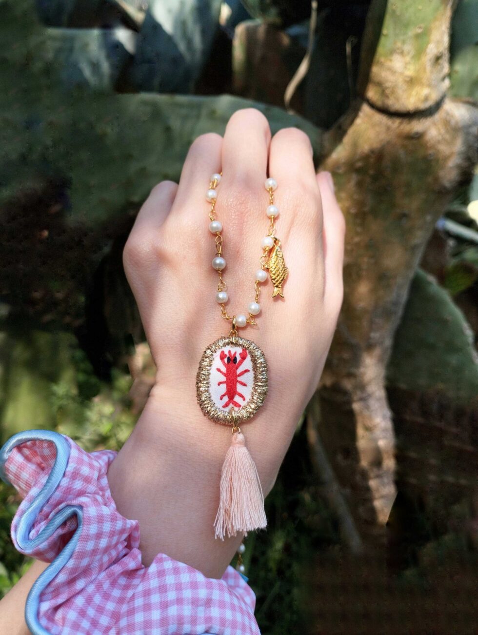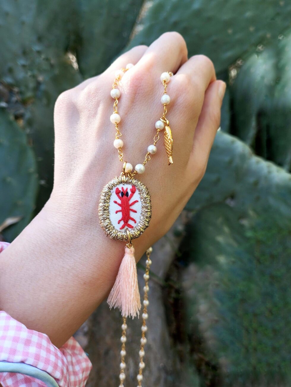 Medaglietta tessile centrale sagoma ovale ricamata a motivo di aragosta rossa su base di cotone bianco panna profilata in filato lurex dorato (misure di circa 2,5 cm per 2 cm) con nappina rosa cipria pendente e dettaglio di cuoricino ricamato rosa profilato oro lurex sul lato.