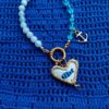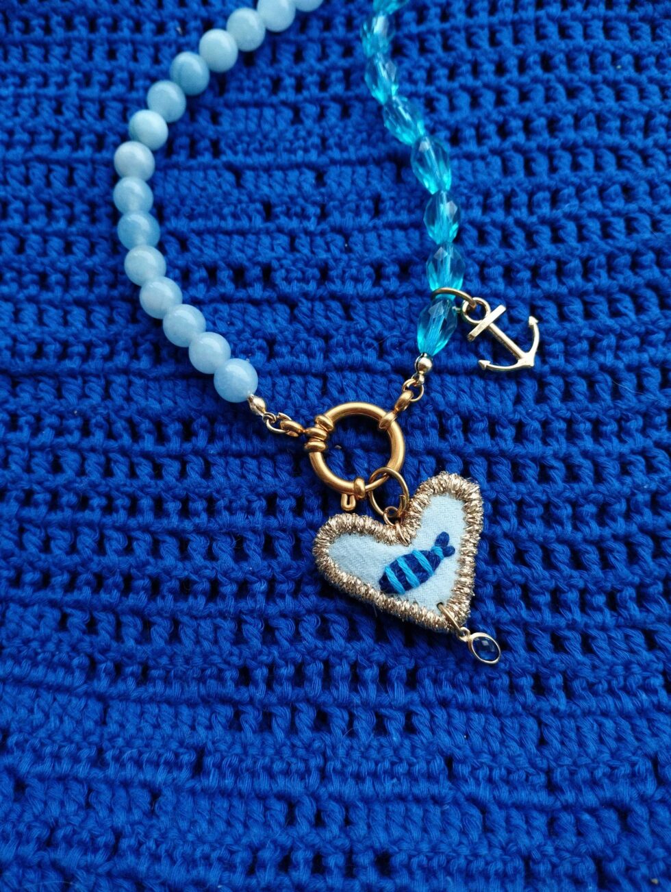 Medaglione tessile centrale con sagoma cuore ricamato a motivo pesciolino blu a righe azzurre su base di cotone di colore azzurro polvere profilata lurex oro (misure circa 2 cm per 1,5 cm) con micro cristallo pendente.