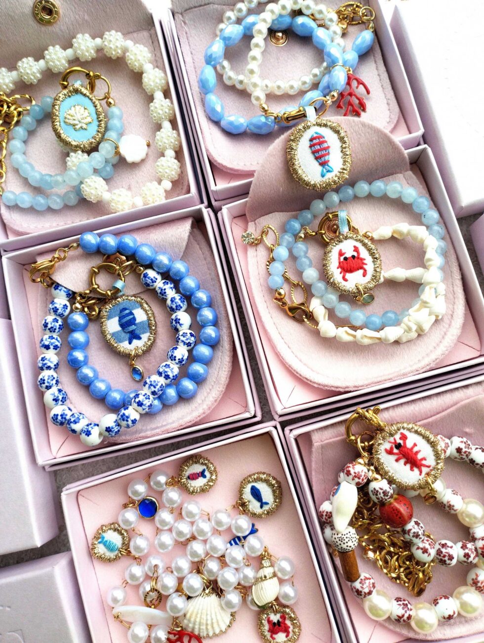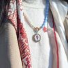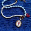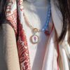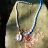 Collana morbida di lunghezza modulabile (si veda la sezione MISURE per la lunghezza esatta) composta da un tratto continuo di perle e da un tratto speculare di cristalli azzurri sfaccettati, con elementi in acciaio inossidabile dorato, ovvero il doppio moschettone (sul retro per chiudere il girocollo e il modello frontale a timone apribile dov’è inserito il ciondolo n tessuto che può dunque essere rimosso) e l’estensione a catena per modularne la lunghezza.