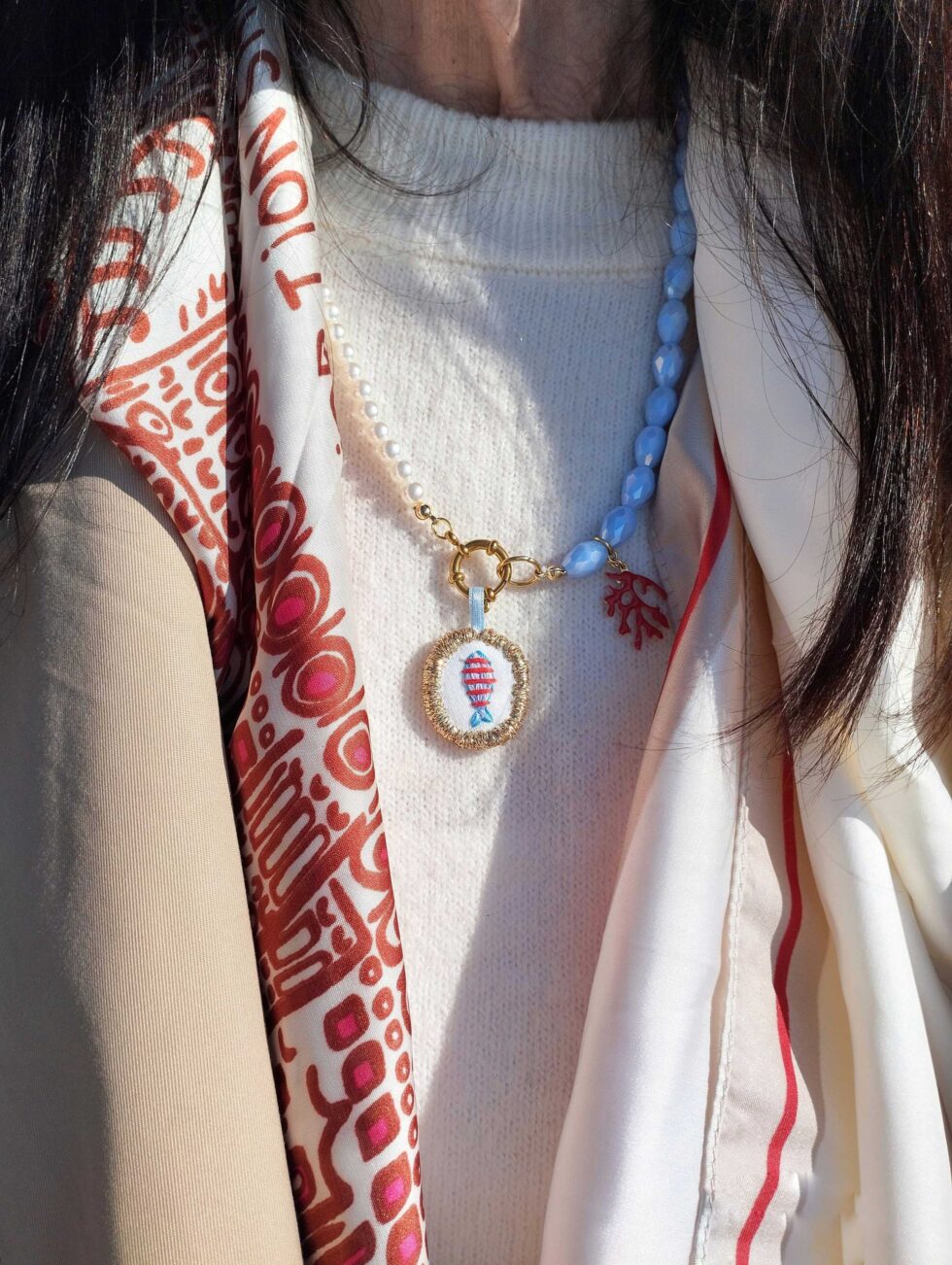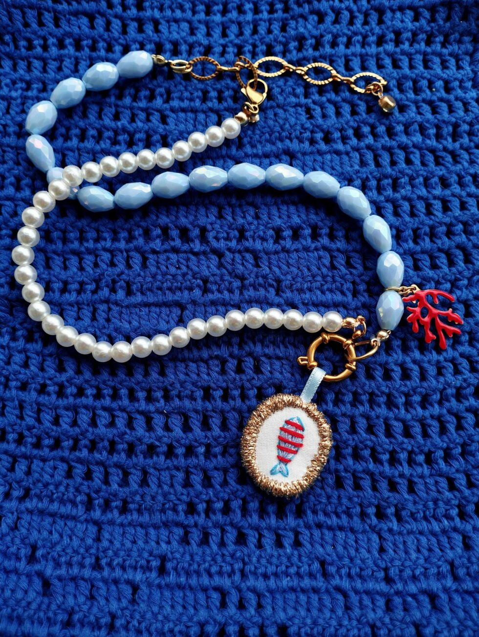 Medaglione tessile centrale con sagoma ovale removibile ricamato a motivo pesciolino azzurro a righe rosse su base di cotone di colore bianco panna profilata lurex oro (misure circa 2 cm per 1,5 cm) con charm rametto di corallo smaltato pendente sul tratto laterale.