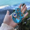 Pendente tessile profilato lurex a foggia di ovale (cm 3 circa di altezza per 2,5 di larghezza nel punto di massima estensione) con ricamo balenottera su fondo in cotone bianco panna e profilatura lurex.