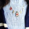 Altri ciondoli: su un lato, charm conchiglia dorata, ramo di corallo smaltato rosso, occhio greco portafortuna e, sul lato opposto, ciondolo pesciolino in acciaio liscio, pesciolino a righe di smalto bianco e piccolo cristallo azzurro.