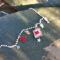 Medaglietta tessile centrale sagoma rettangolare ricamata a motivo granchietto rosso su base di cotone panna profilata in lurex oro (misure di circa 1,5 cm per 2 cm).