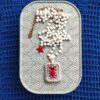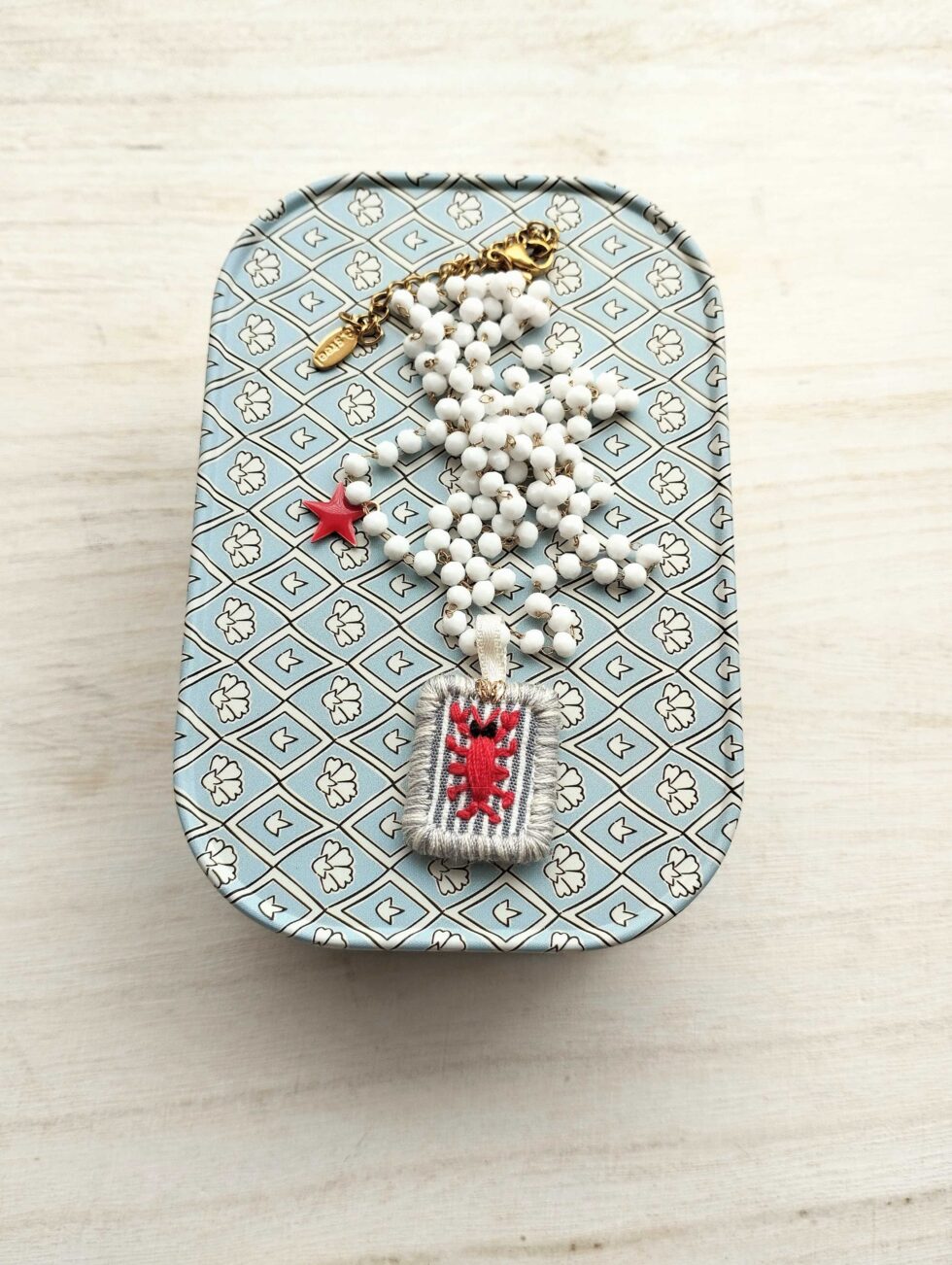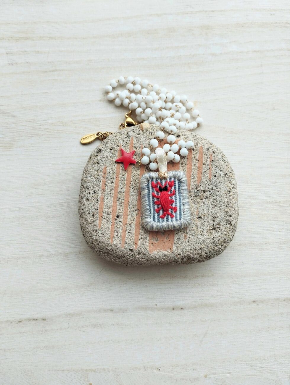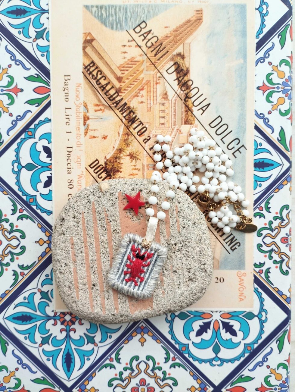 Medaglietta tessile centrale sagoma rettangolare ricamata a motivo di piccola aragosta rossa su base di cotone rigato bianco e azzurro profilata nei toni pastello di azzurrino tenue e bianco panna (misure di circa 2 cm per 1,5 cm) con stellina smaltata sul lato.