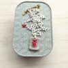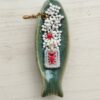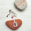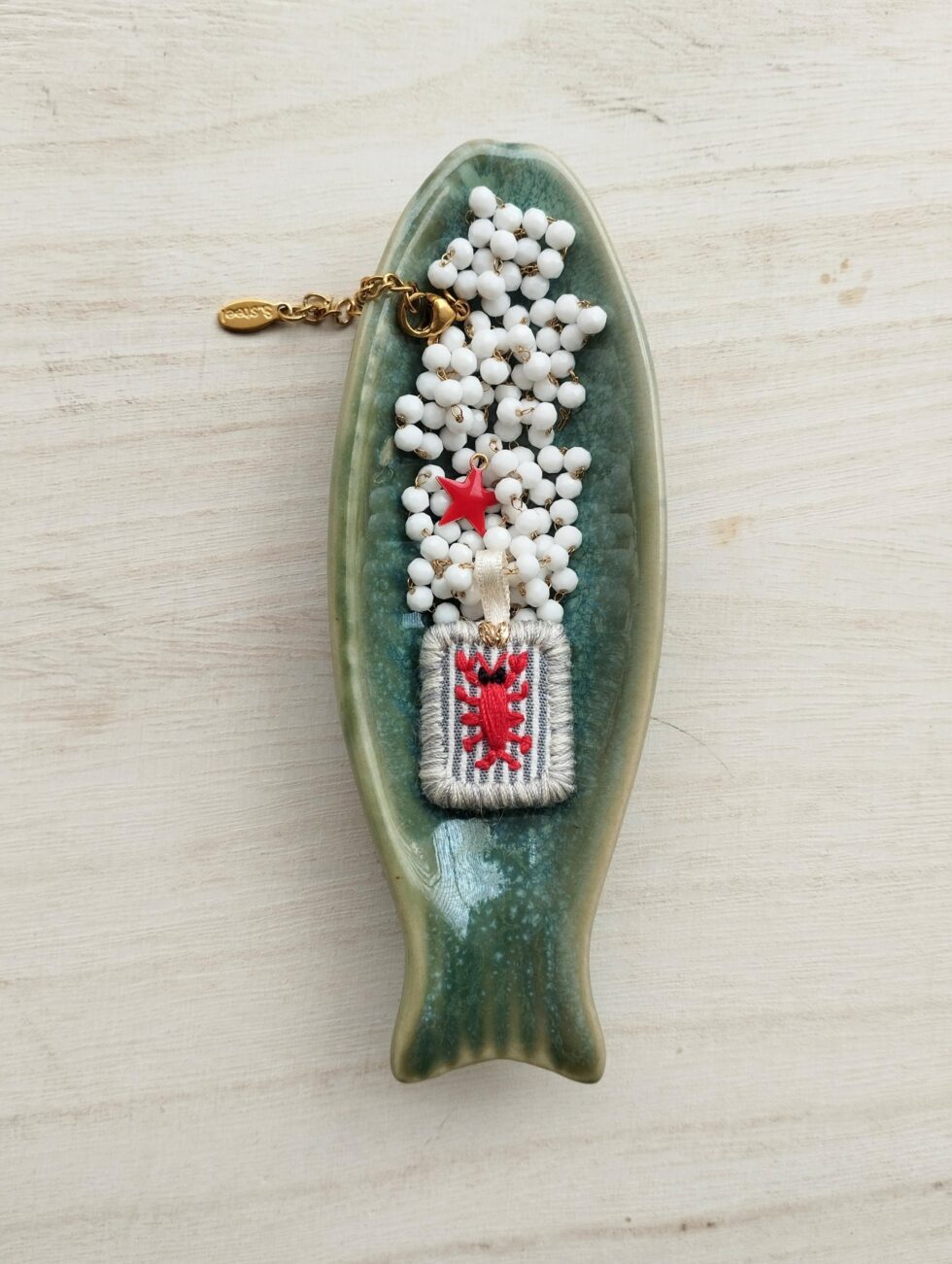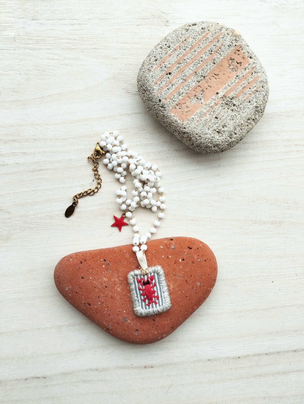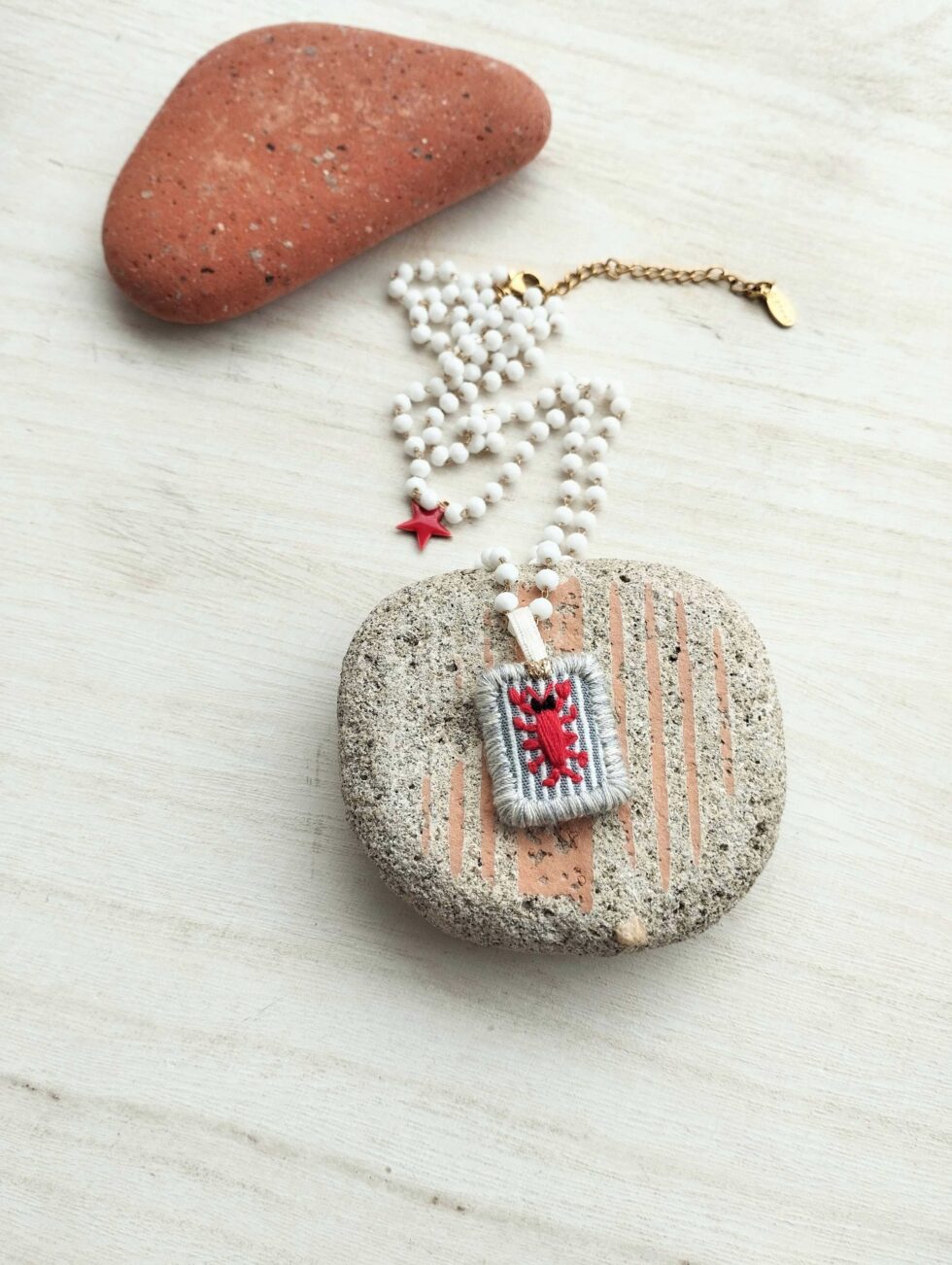 Medaglietta tessile centrale sagoma rettangolare ricamata a motivo di piccola aragosta rossa su base di cotone rigato bianco e azzurro profilata nei toni pastello di azzurrino tenue e bianco panna (misure di circa 2 cm per 1,5 cm) con stellina smaltata sul lato.