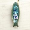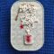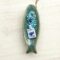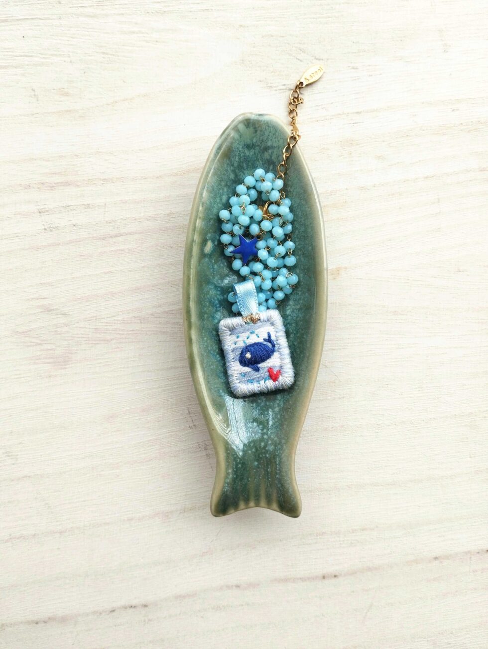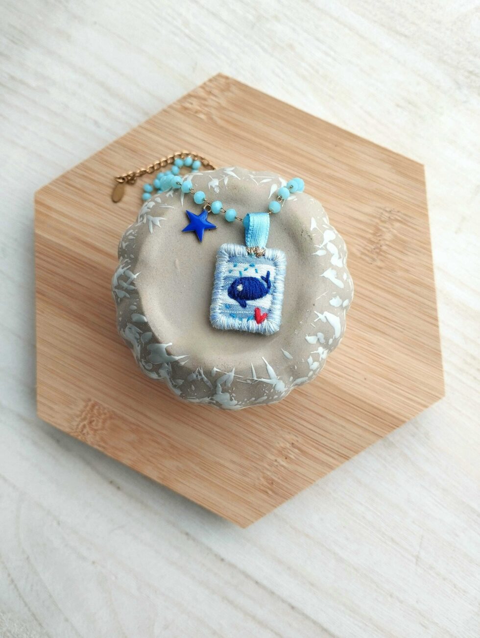 Medaglietta tessile centrale sagoma rettangolare ricamata a motivo di piccola balenottera blu e cuoricino rosso su base di cotone rigato bianco e azzurro profilata nei toni pastello di azzurrino tenue e bianco panna (misure di circa 2 cm per 1,5 cm) con stellina smaltata sul lato.