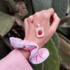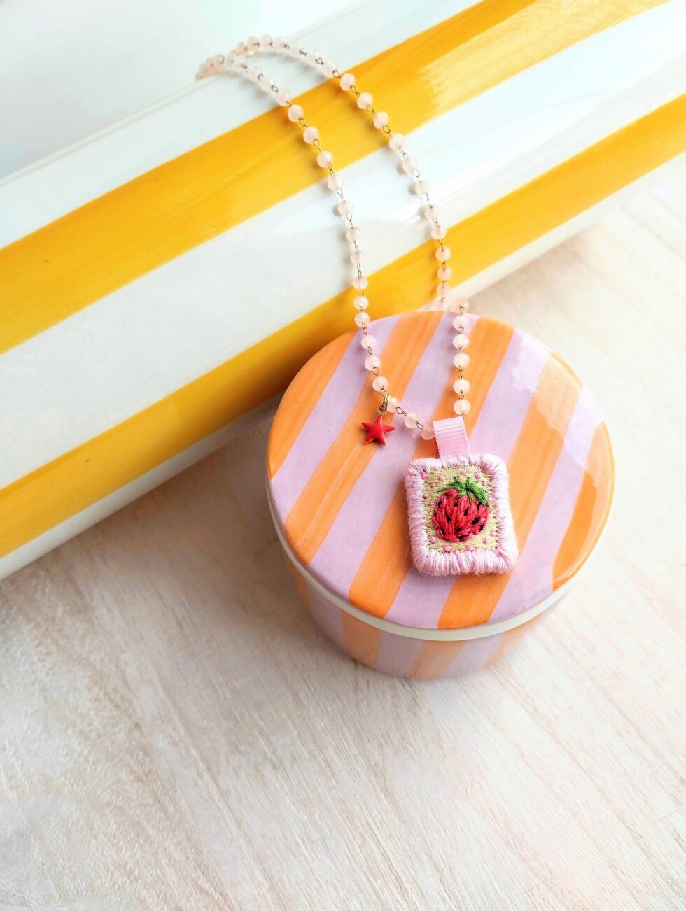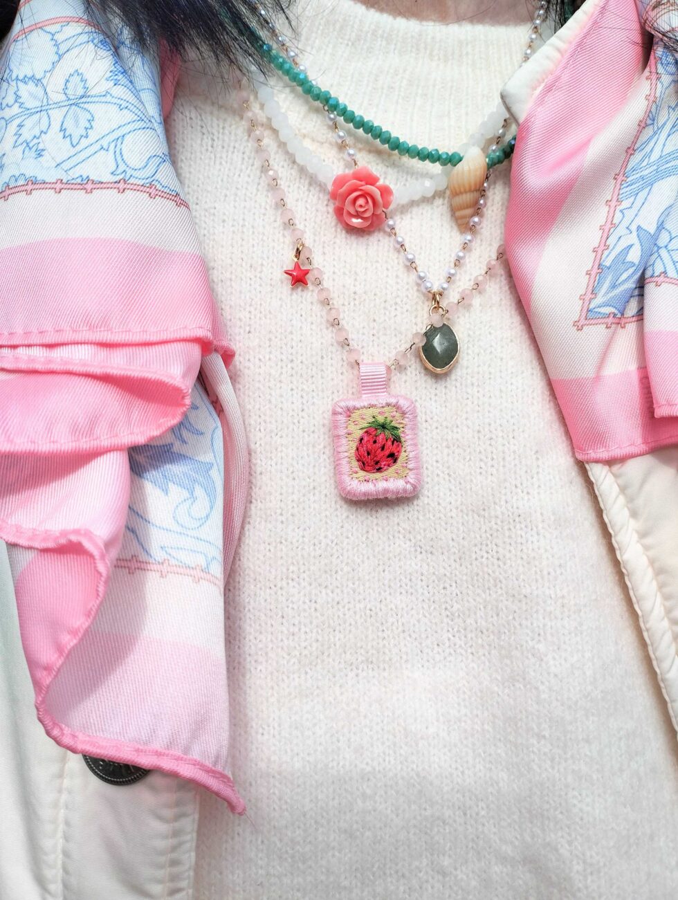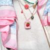 Medaglietta tessile centrale sagoma rettangolare ricamata a motivo di fragola rossa con sfondo a puntini rosati su base di cotone giallino tenue profilata nei delicati toni del rosa pastello (misure circa 2 cm per 1,5 cm).
