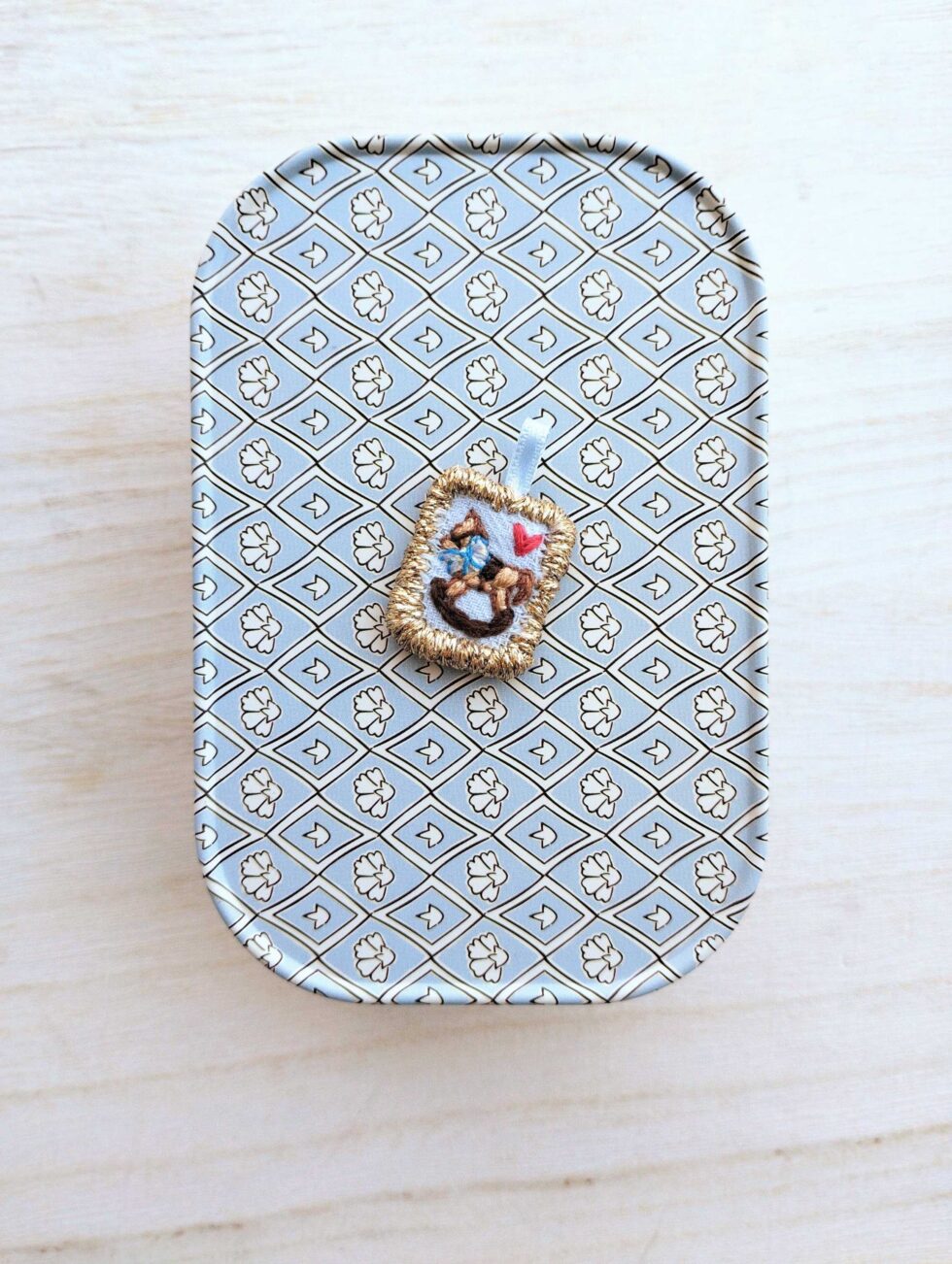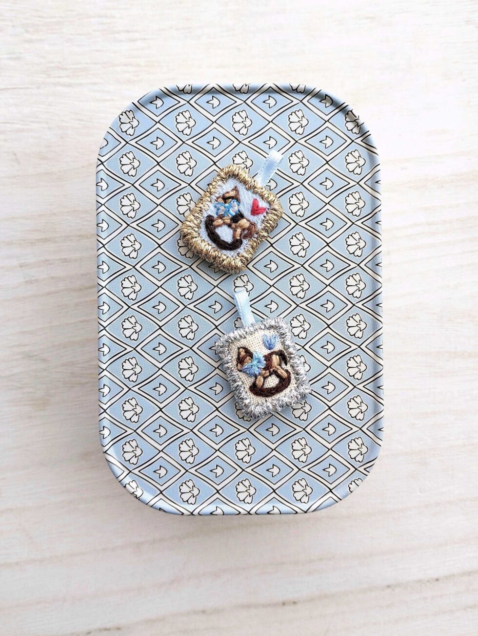 Foggia rettangolare con ricamo a soggetto cavallino a dondolo nei toni del beige e marrone con dettaglio di fiocchetto azzurro e panna.