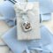 Ciondolo in tessuto di lino di colore azzurro pastello dotato di un gancino in asola in nastro di raso sufficientemente grande per far scorrere un moschettone di medie dimensioni.