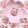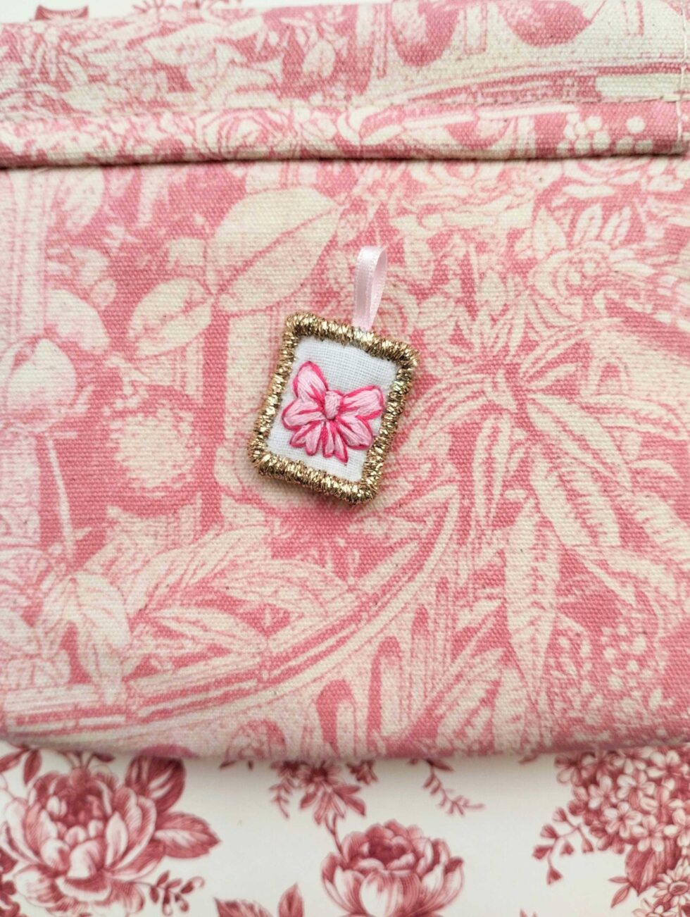 Foggia rettangolare con ricamo a soggetto fiocchetto rosa con dettagli fucsia.