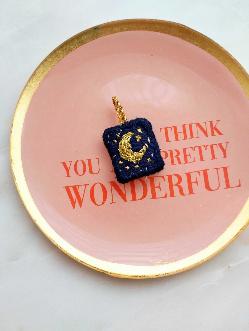 Foggia rettangolare con ricamo a soggetto luna e stelle dorate.