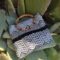 Ciondolo in tessuto di cotone rigato bianco e azzurrino dotato di un gancino in asola in nastro di raso sufficientemente grande per far scorrere un moschettone di medie dimensioni.
