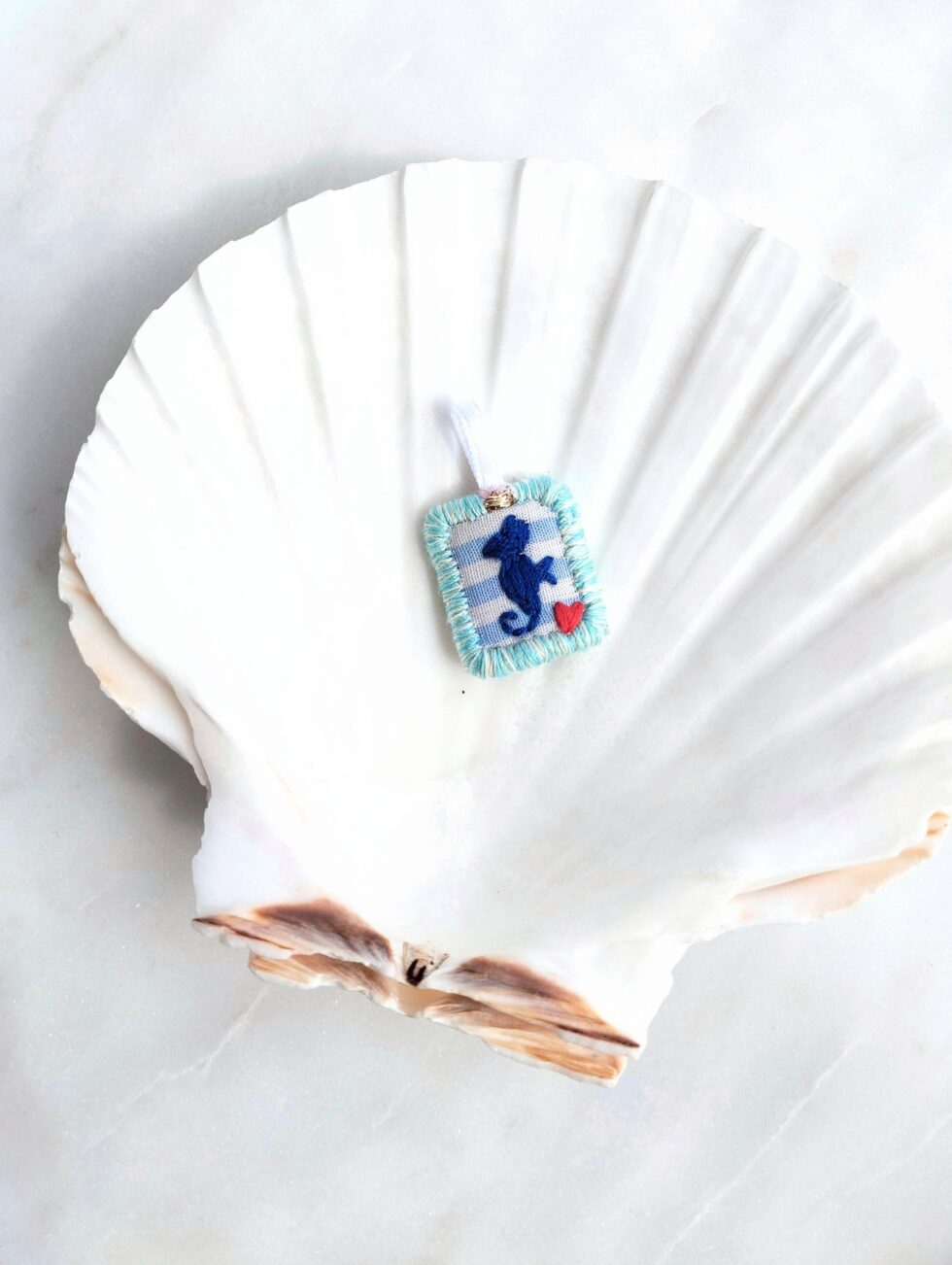 Foggia rettangolare con spiritoso ricamo di ippocampo blu vivace.