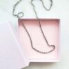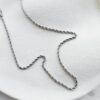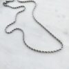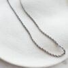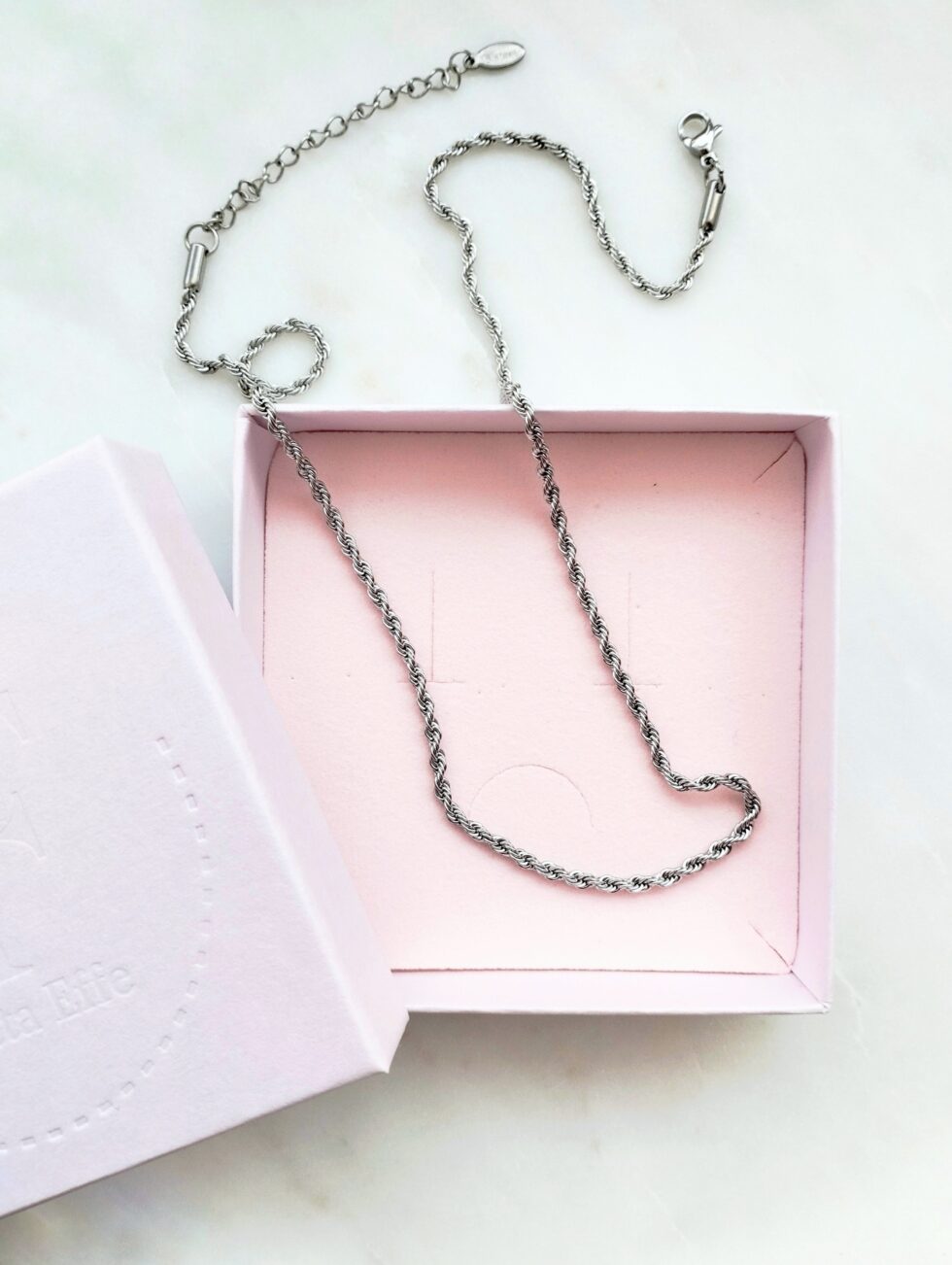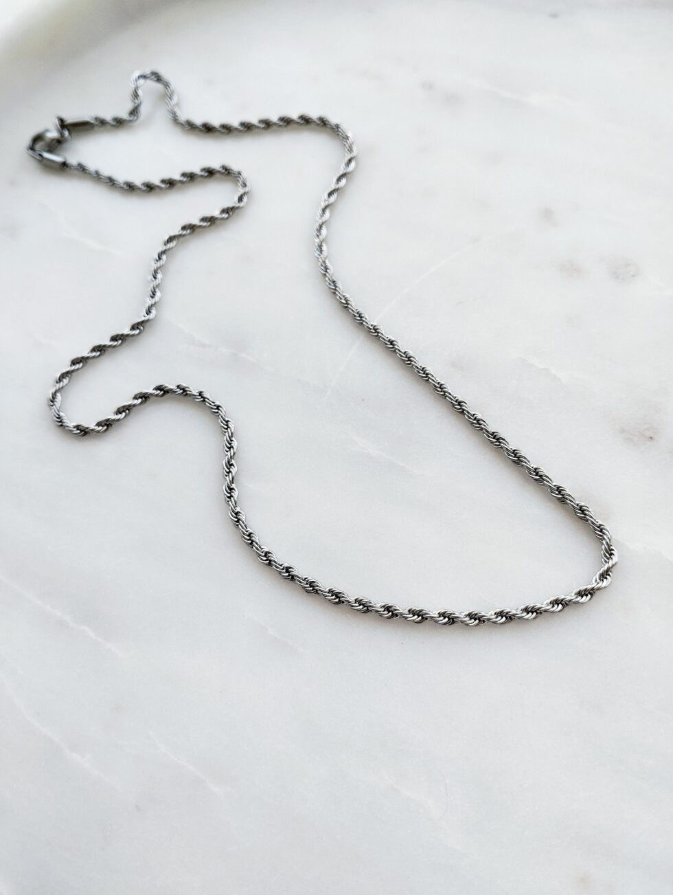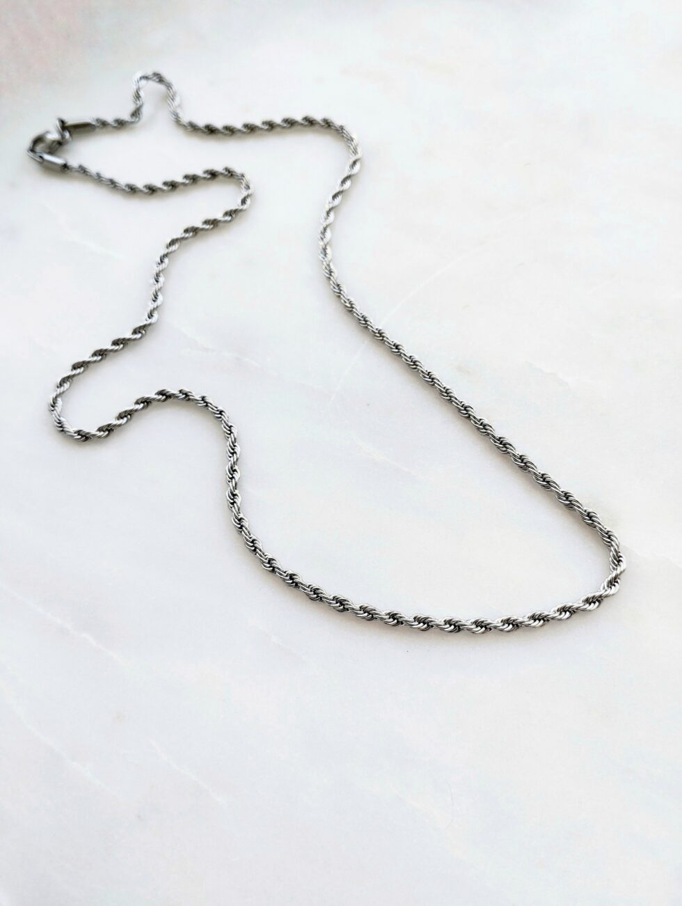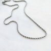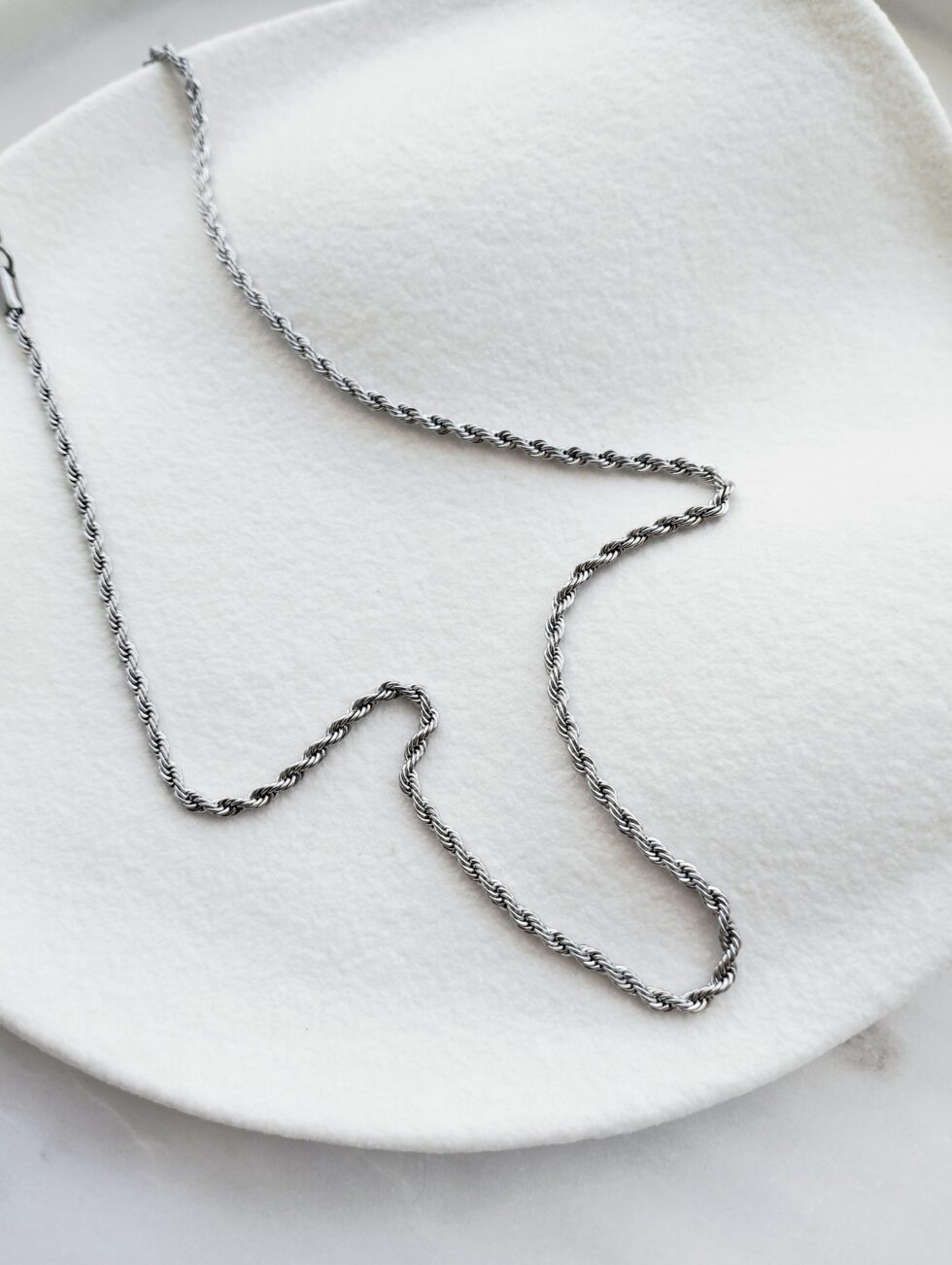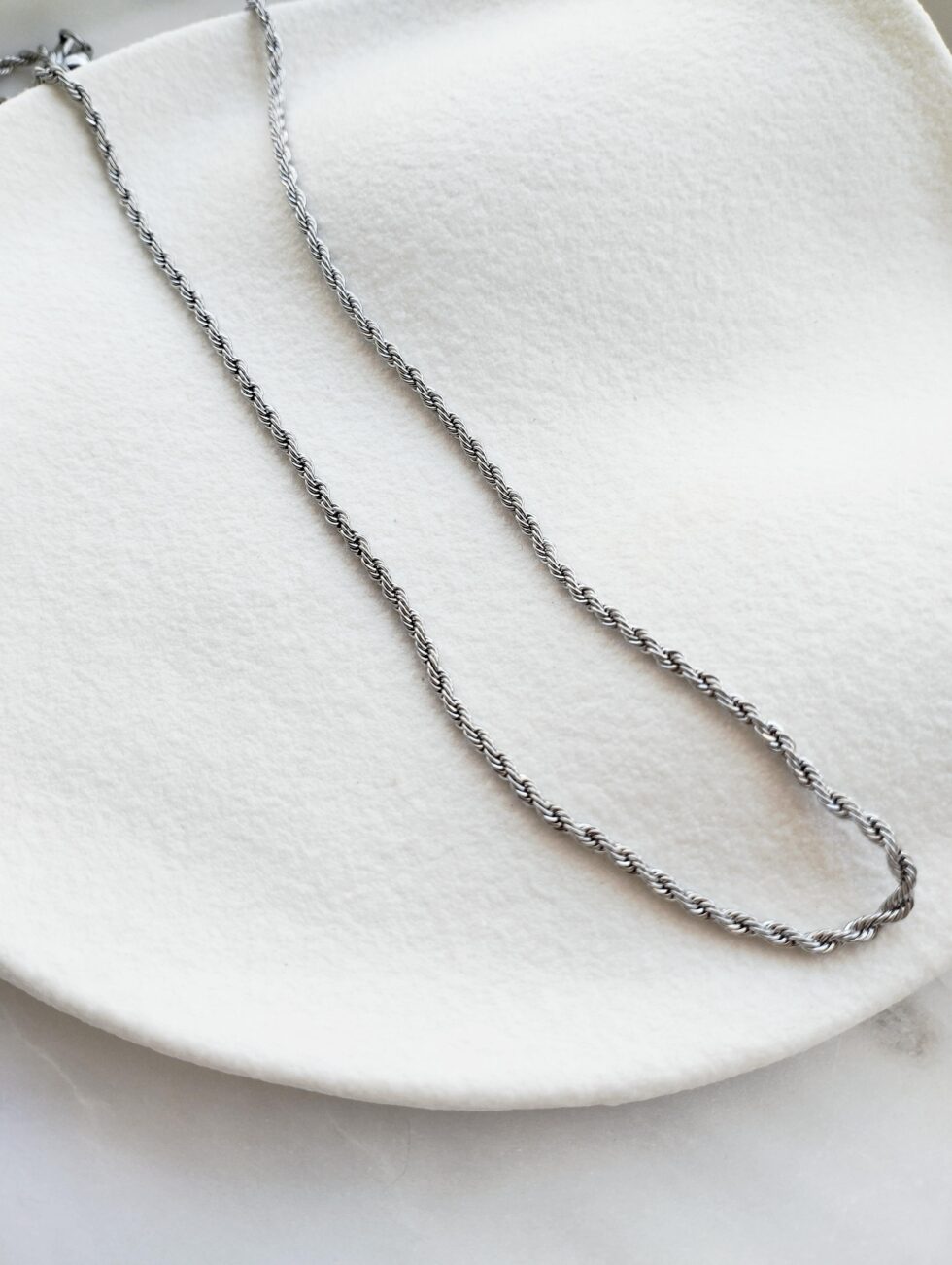 Catena modello “torchon” (letteralmente “attorcigliato” per richiamare la particolare lavorazione della maglia metallica che si avvolge su se stessa a spirale, regalando luce e sfavillio alla collana) in acciaio inossidabile ed anallergico finitura argento.