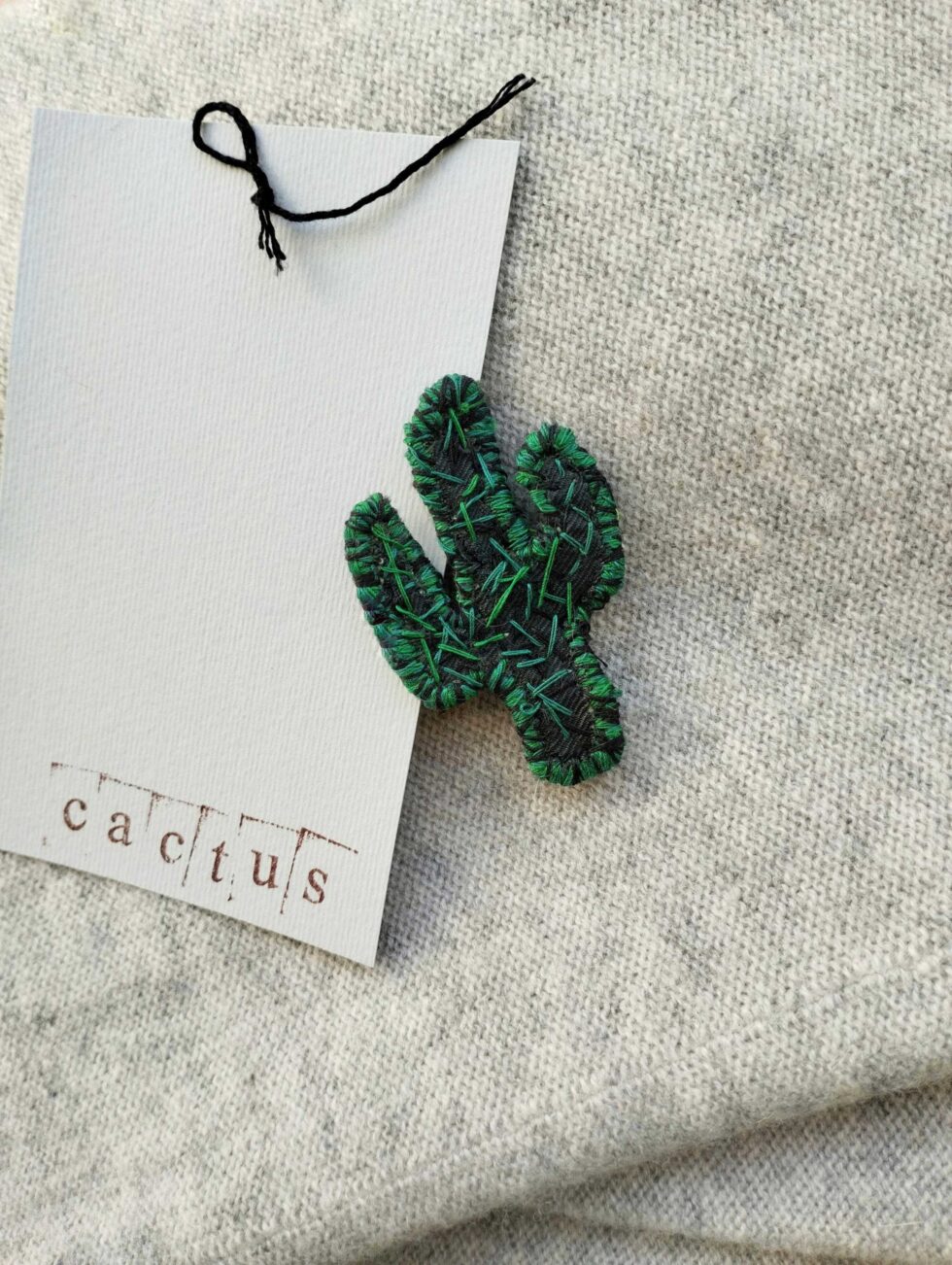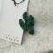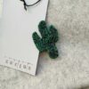 Spilla tessile con chiusura sul retro in metallo e frontale a foggia di cactus colonnare (misure 5 cm di altezza per 3 cm circa nel punto di massima larghezza) in raso verde scuro con ricamo sull’intera superficie a simulazione delle piccole spine di cactus.