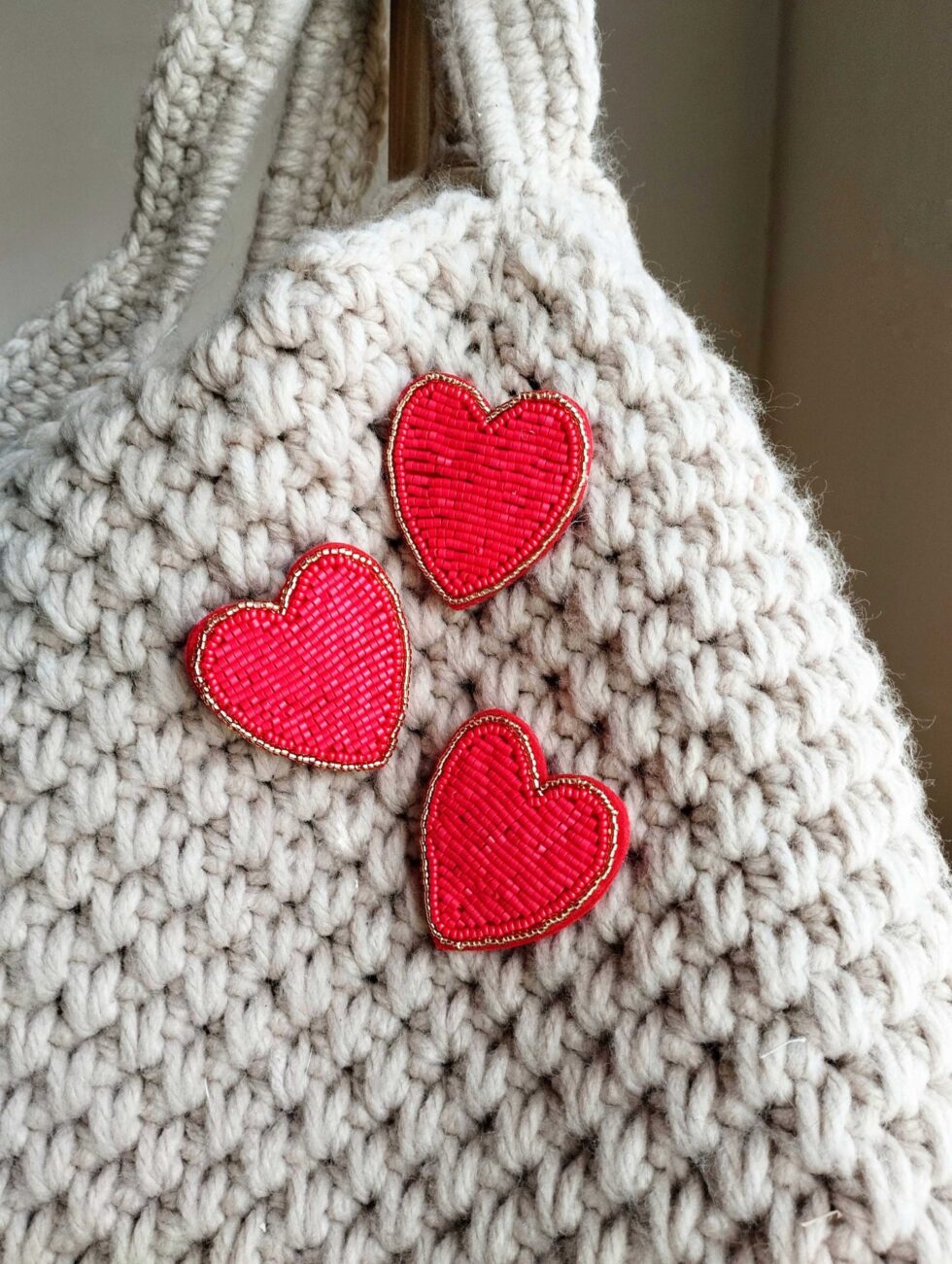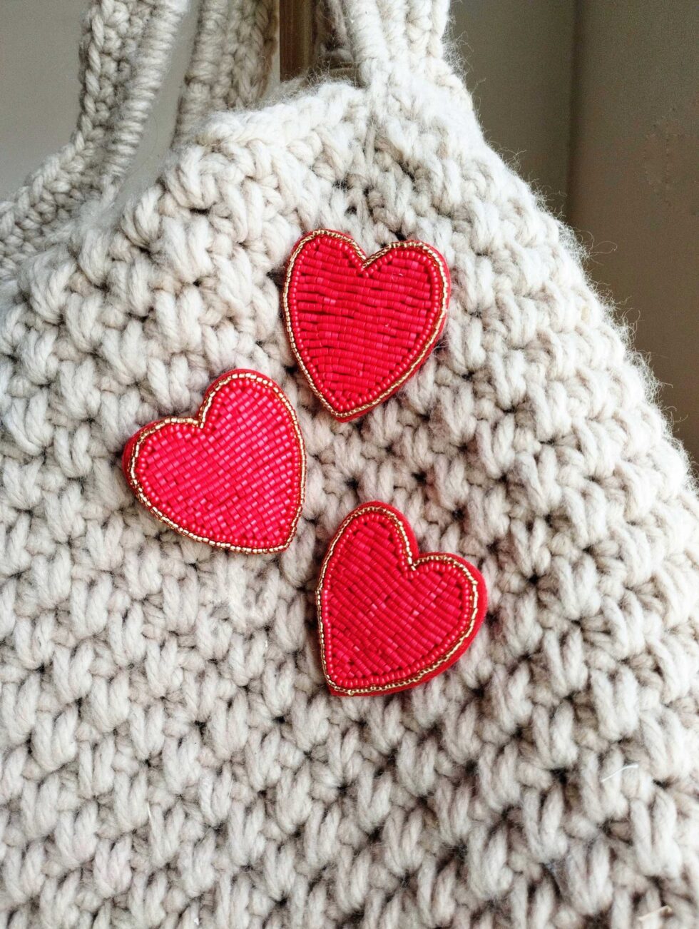 Spilla tessile con chiusura sul retro in metallo e frontale a foggia di grande cuore (misure 4,5 cm per 4,5 cm circa) in panno con perline di conteria rossa e dorata cucite sull’intera superficie.