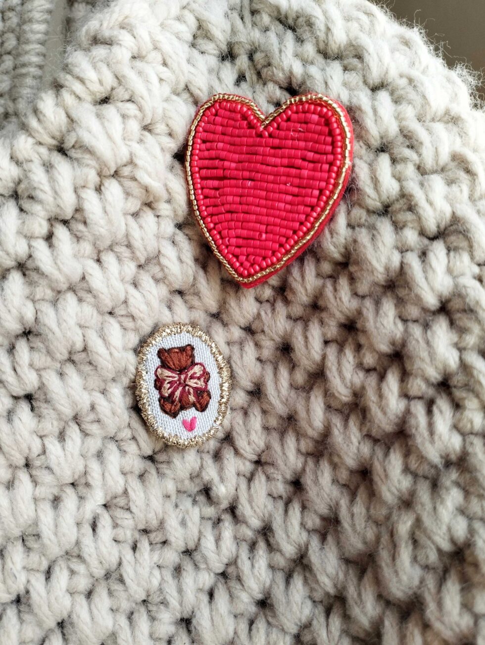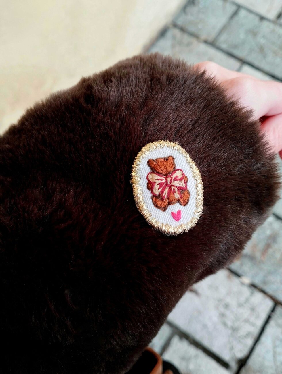Spilla tessile con chiusura sul retro in metallo e cabochon frontale ovale (misure: 3 cm per 2,5 cm) ricamato a motivo orsetto marrone con fiocchetto beige dai dettagli bordeaux su base di lino color grigio chiaro interamente profilata di filato lurex.