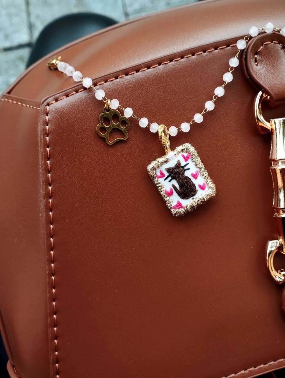 Mini medaglietta tessile rettangolare (misure di circa 1,5 cm per 2 cm) in stoffa di cotone bianco panna con tenero ricamo gattino marrone scuro e cuoricini rosa vivace. Profilatura dorata in lurex.