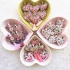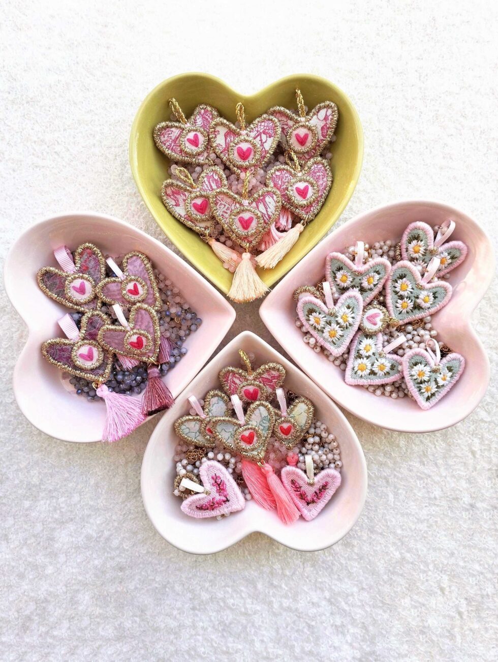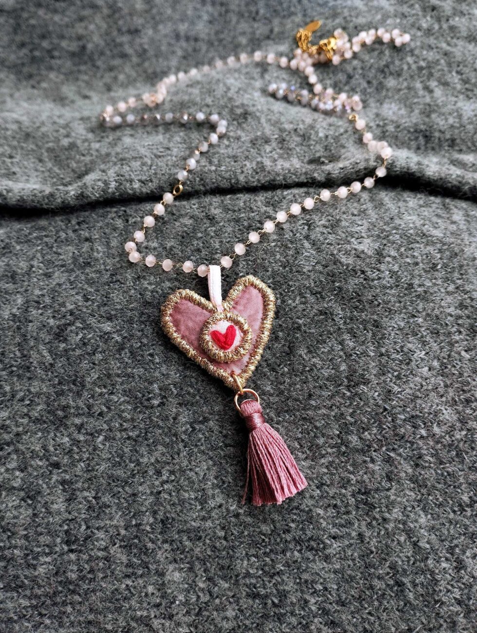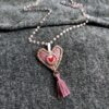 Medaglietta tessile centrale sagoma cuore in raso fantasia color malva chiaro con dettaglio di cuoricino frontale ricamato in filato color lampone (misure di circa 2 cm per 2 cm) e di nappina in seta color malva.