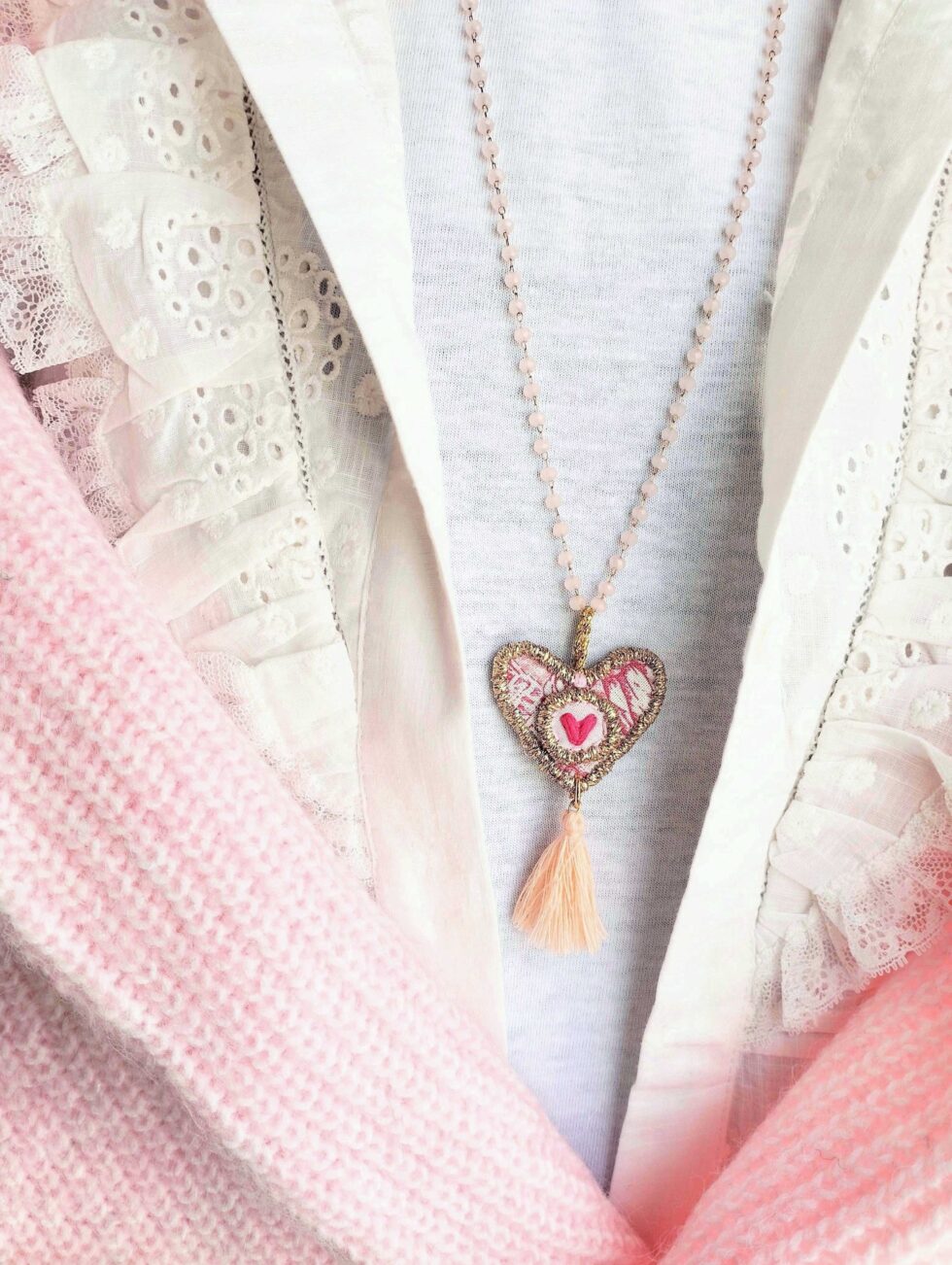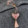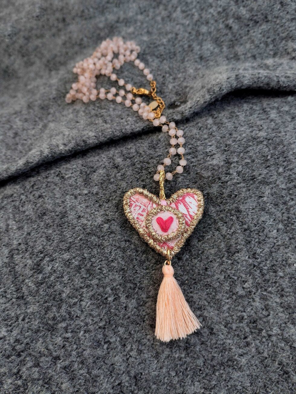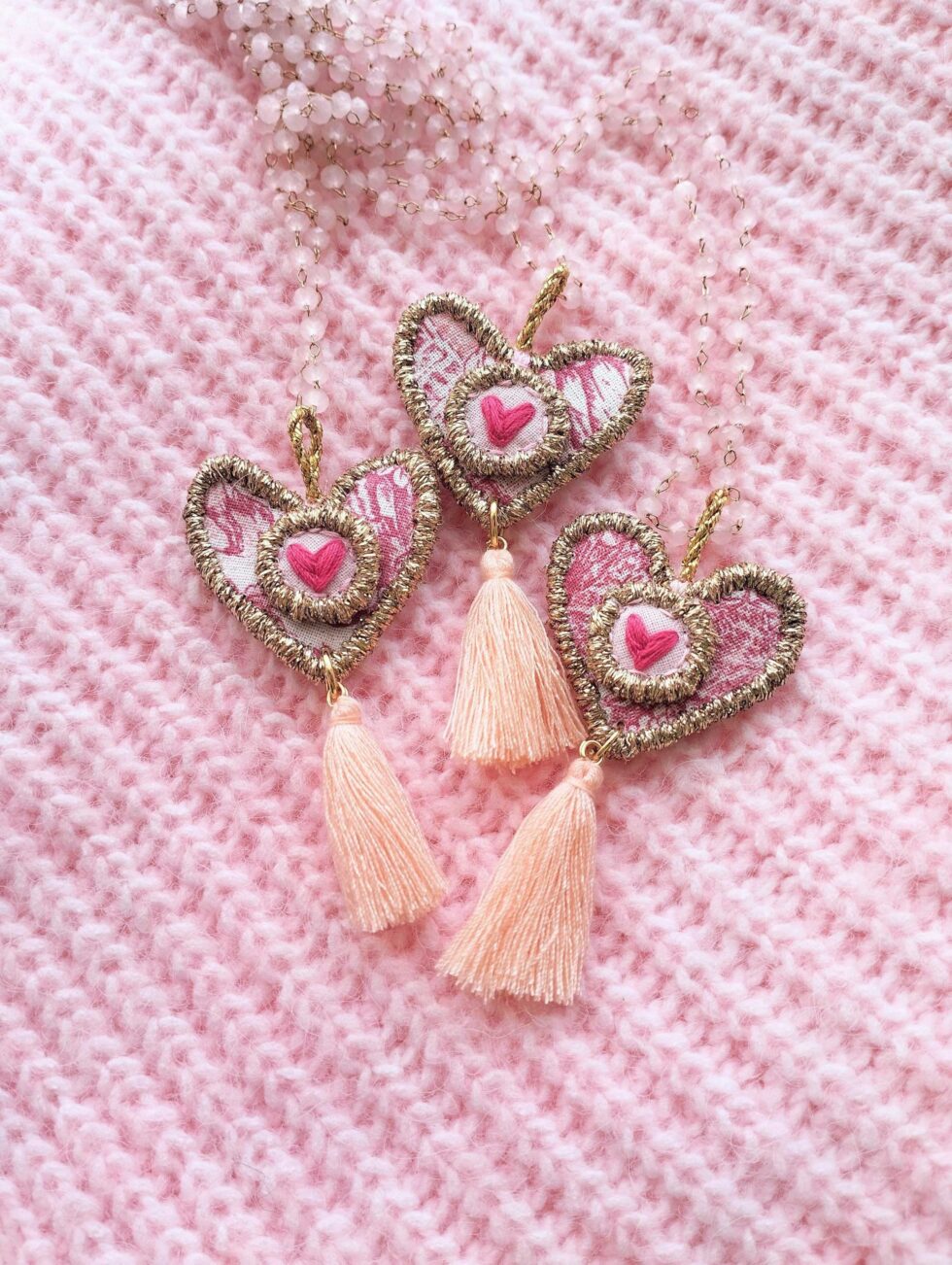 Medaglione tessile centrale sagoma cuore in cotone fantasia ‘toile de jouy’ rosa con ricamo a motivo di delicato cuoricino su base di cotone rosa pastello (misure di circa 3 cm per 3 cm). Tutte le profilature sono realizzate in filato oro lurex. Nappina in cotone rosa cipria.
