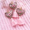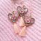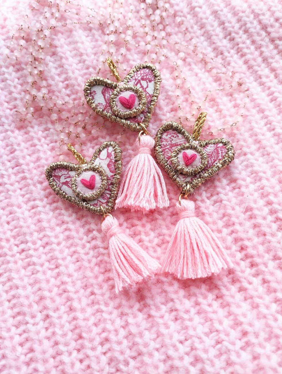 Medaglione tessile centrale sagoma cuore in cotone fantasia ‘toile de jouy’ rosa con ricamo a motivo di delicato cuoricino su base di cotone rosa pastello (misure di circa 3 cm per 3 cm). Tutte le profilature sono realizzate in filato oro lurex. Nappina in cotone rosa pastello freddo.
