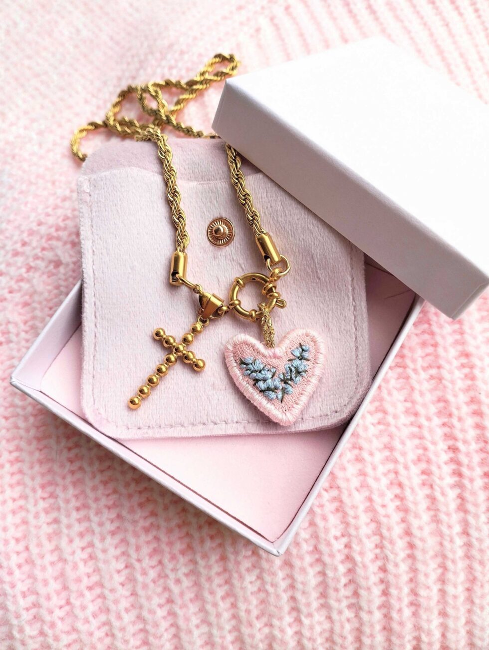 Medaglione tessile centrale con sagoma cuore removibile ricamato a motivo di fiori ramificati nei toni dell’azzurrino su base di lino di colore rosa tenue profilata nei toni (misure circa 2 cm per 2 cm).