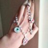 Collana girocollo modello rosario multicharms (si veda la sezione MISURE per la lunghezza esatta in cm) con perle bianche di medie dimensioni e maglia metallica in acciaio inossidabile ed anallergico argentato.