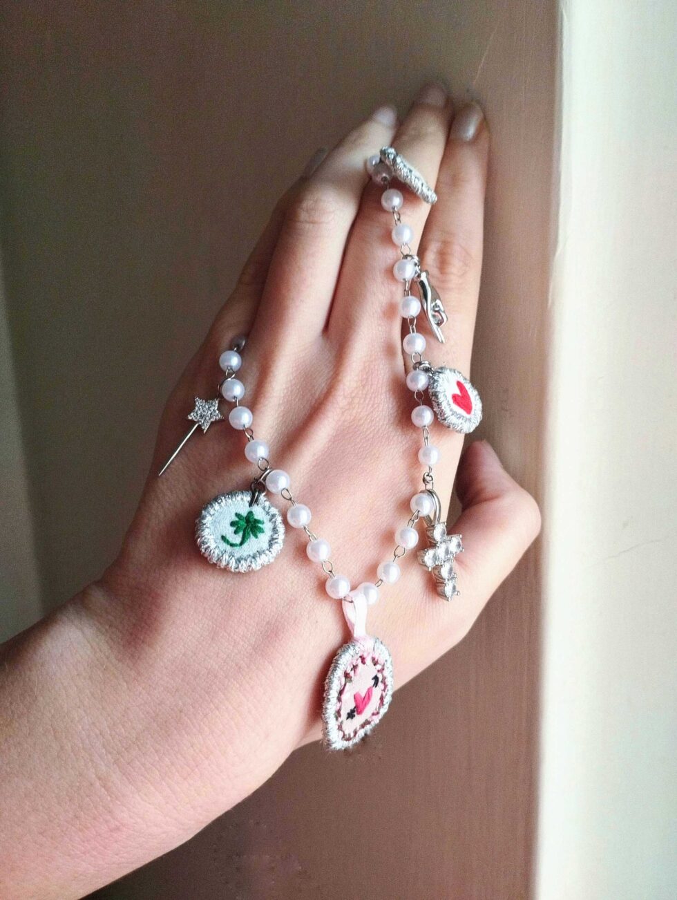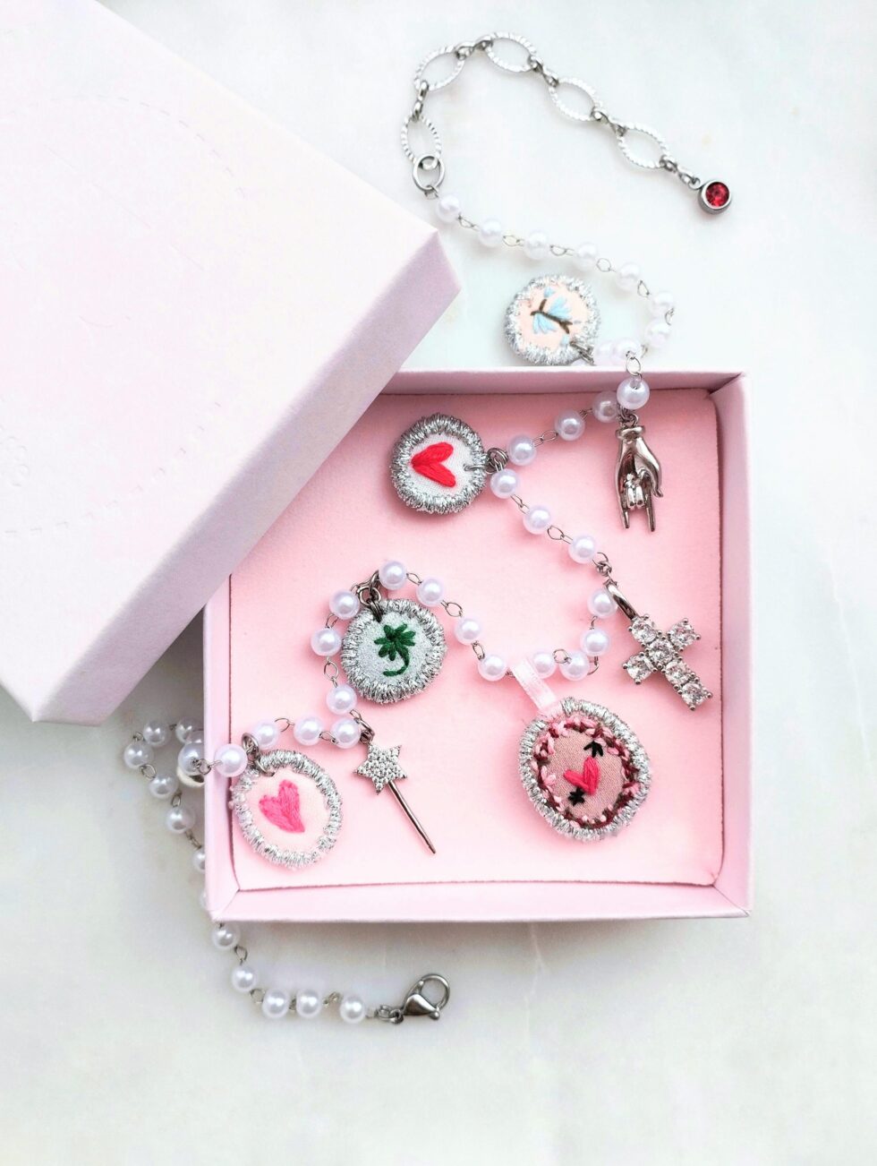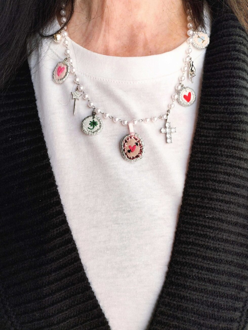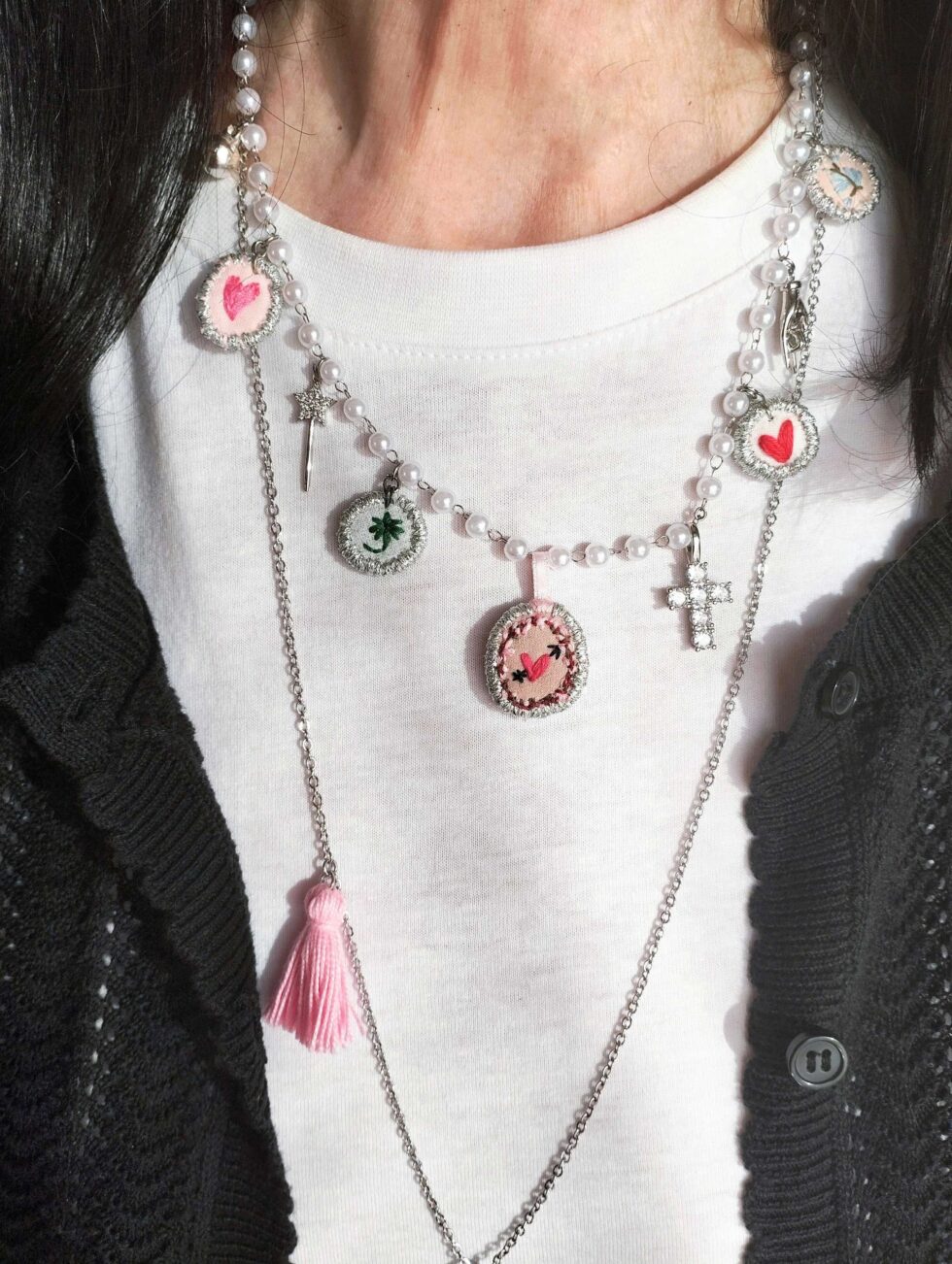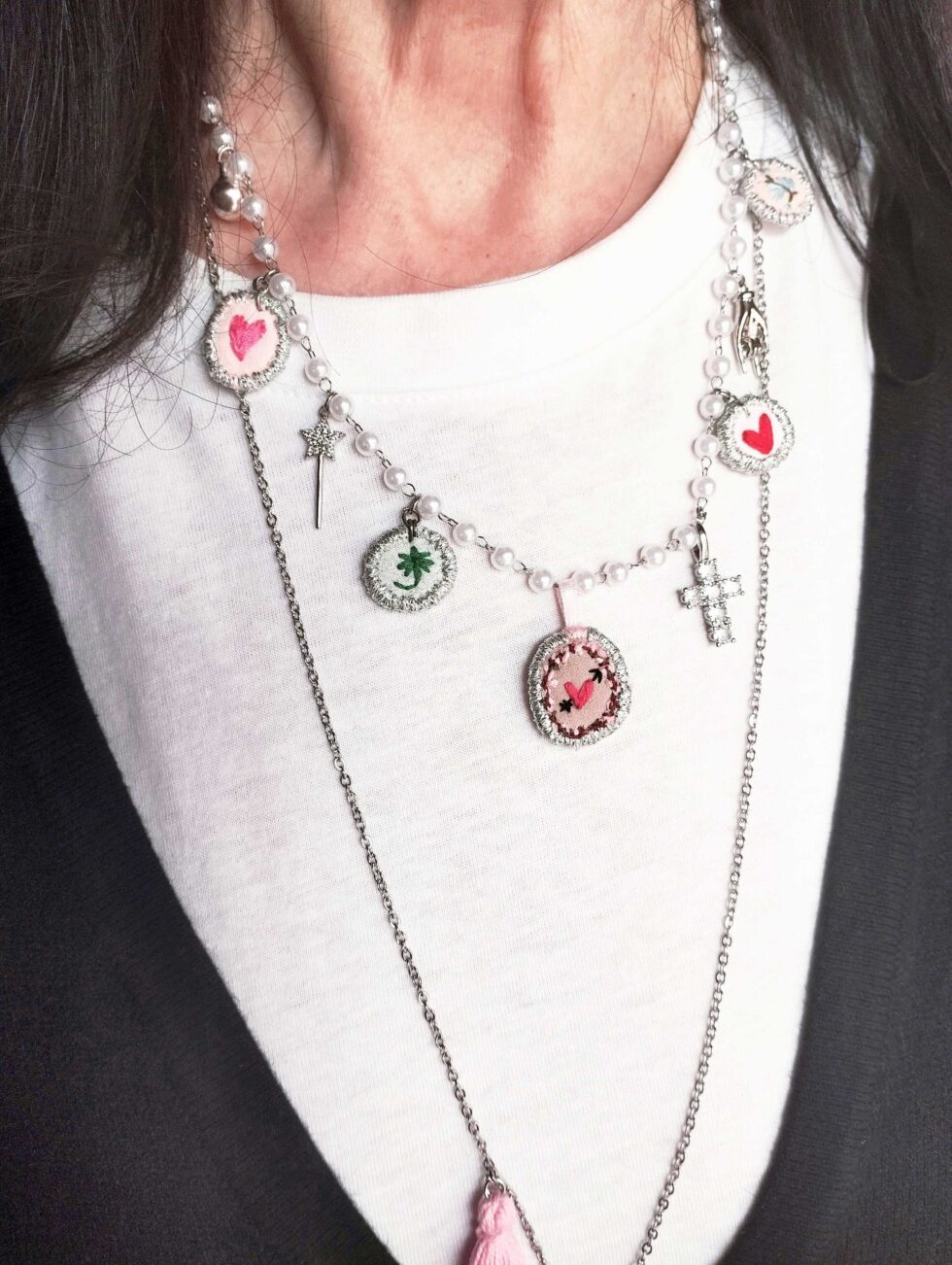Altri ciondoli tessili: su un lato, medaglietta tessile ovale ricamata a motivo cuore rosa fucsia su base di cotone rosa pastello profilata lurex, medaglietta tessile tonda ricamata a motivo quadrifoglio su base di cotone grigio chiaro profilata lurex, sul lato opposto: medaglietta tessile tonda ricamata a motivo cuore rosso su base di cotone panna profilata lurex, medaglietta tessile tonda ricamata a motivo fiorellini azzurri su base di cotone rosa profilata lurex.