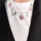 Altri ciondoli tessili: su un lato, medaglietta tessile ovale ricamata a motivo cuore rosa fucsia su base di cotone rosa pastello profilata lurex, medaglietta tessile tonda ricamata a motivo quadrifoglio su base di cotone grigio chiaro profilata lurex, sul lato opposto: medaglietta tessile tonda ricamata a motivo cuore rosso su base di cotone panna profilata lurex, medaglietta tessile tonda ricamata a motivo fiorellini azzurri su base di cotone rosa profilata lurex.