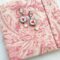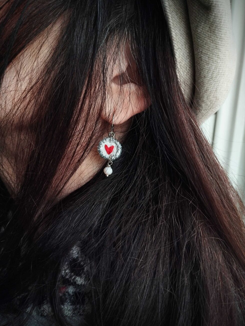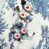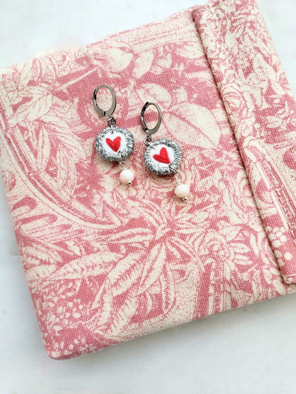 Medaglietta tessile di forma tonda (circa 1,5 cm di diametro) in tessuto bianco panna profilato in lurex argento con ricamo cuoricino rosso.