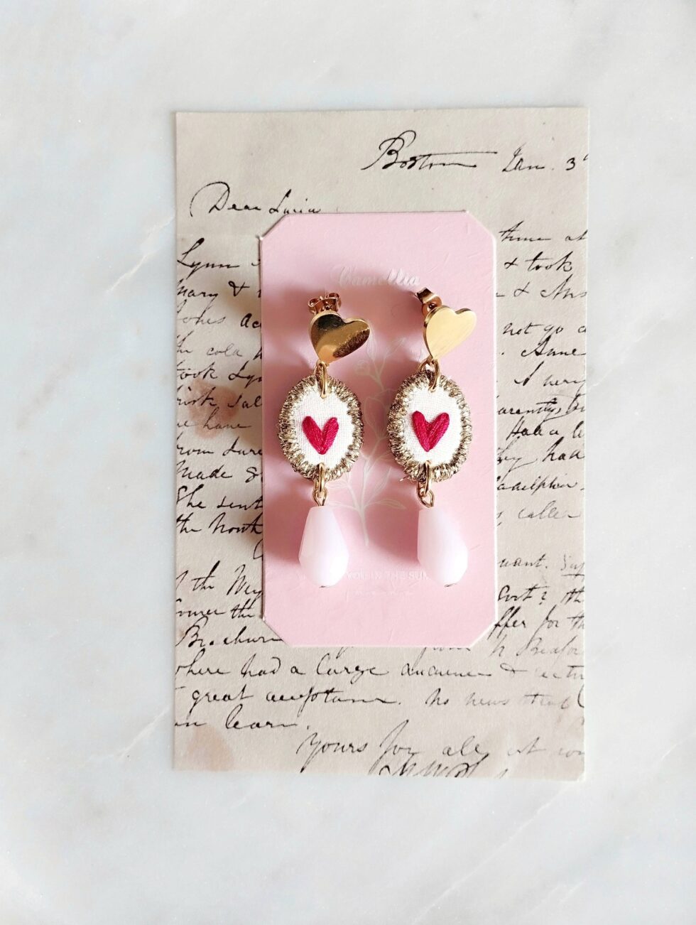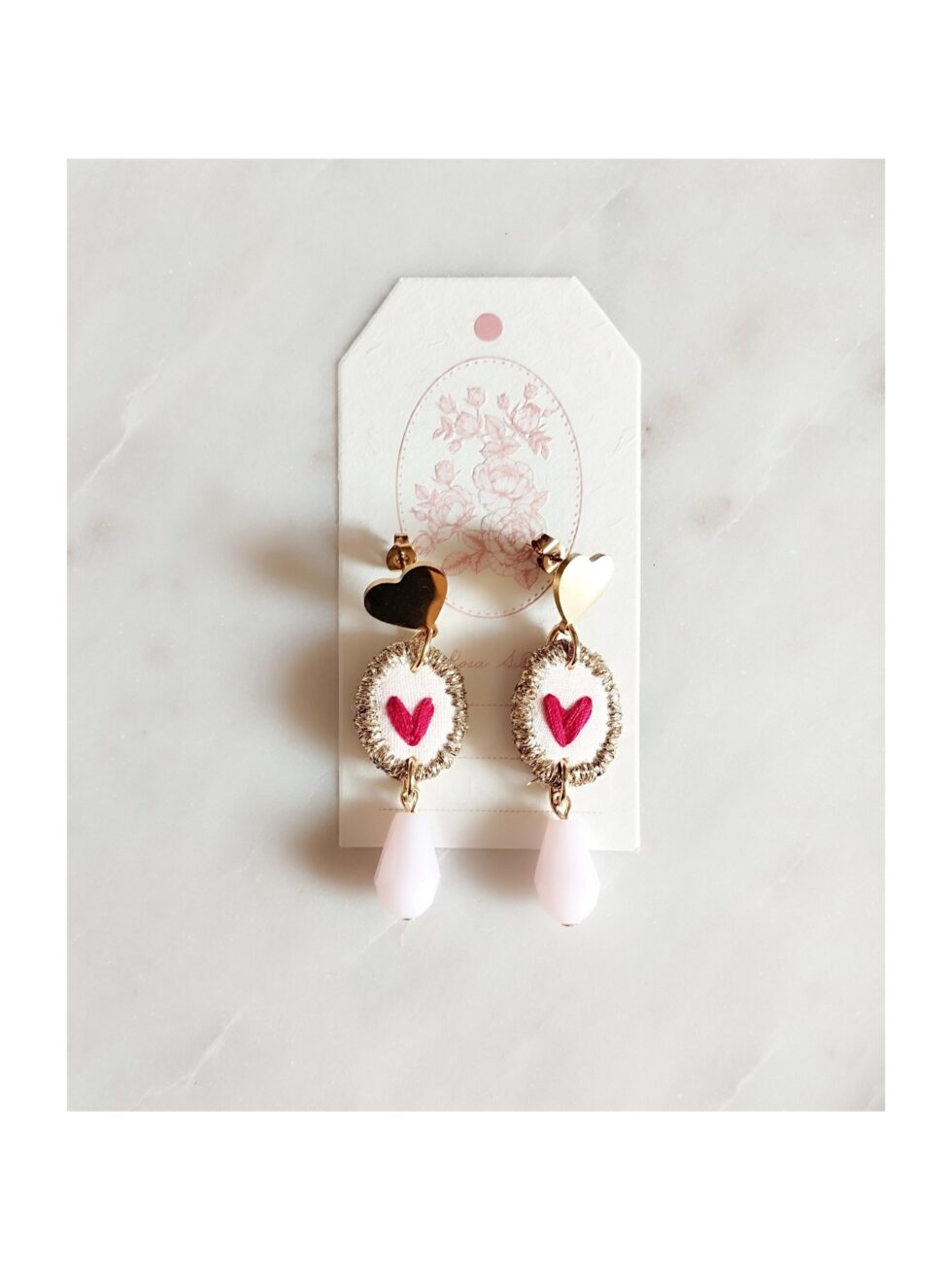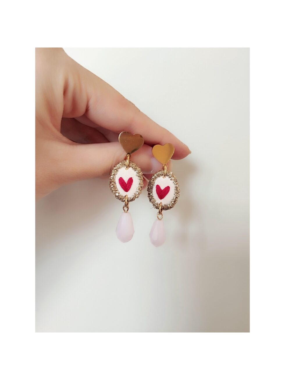 Base tessile di forma ovale (circa 2 cm per 1,5 cm) in tessuto bianco panna profilato in lurex oro con ricamo cuoricino rosso lampone (rosso freddo).