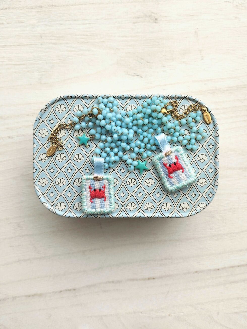 Medaglietta tessile centrale sagoma rettangolare ricamata a motivo granchietto rosso su base di cotone rigato azzurro e bianco profilata nei toni (misure di circa 2 cm per 1,5 cm) con stellina smaltata azzurro vivace sul lato.