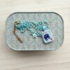 Collana modello rosario (si veda la sezione MISURE per i cm esatti) con graziosi micro cristalli di colore azzurro e maglia metallica in acciaio inossidabile ed anallergico dorato.