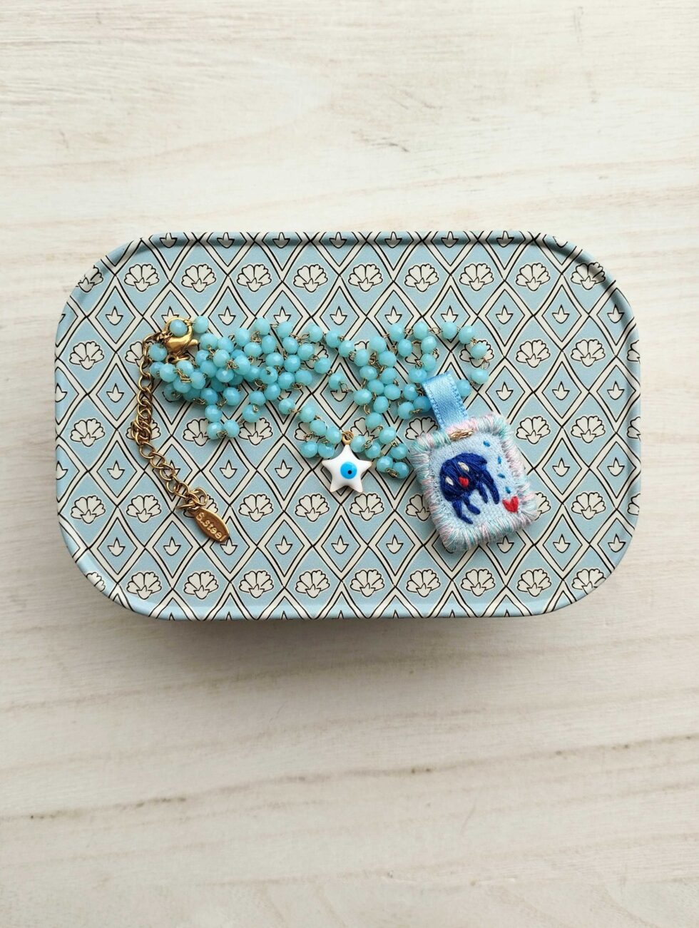 Medaglietta tessile centrale sagoma rettangolare ricamata a motivo di piccola medusa blu e cuoricino rosso su base di cotone azzurro profilata nei toni pastello di azzurrino e rosa tenue (misure di circa 2 cm per 1,5 cm) con stellina smaltata sul lato.