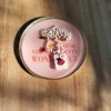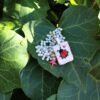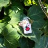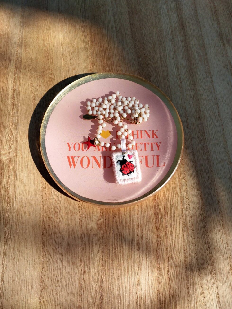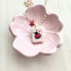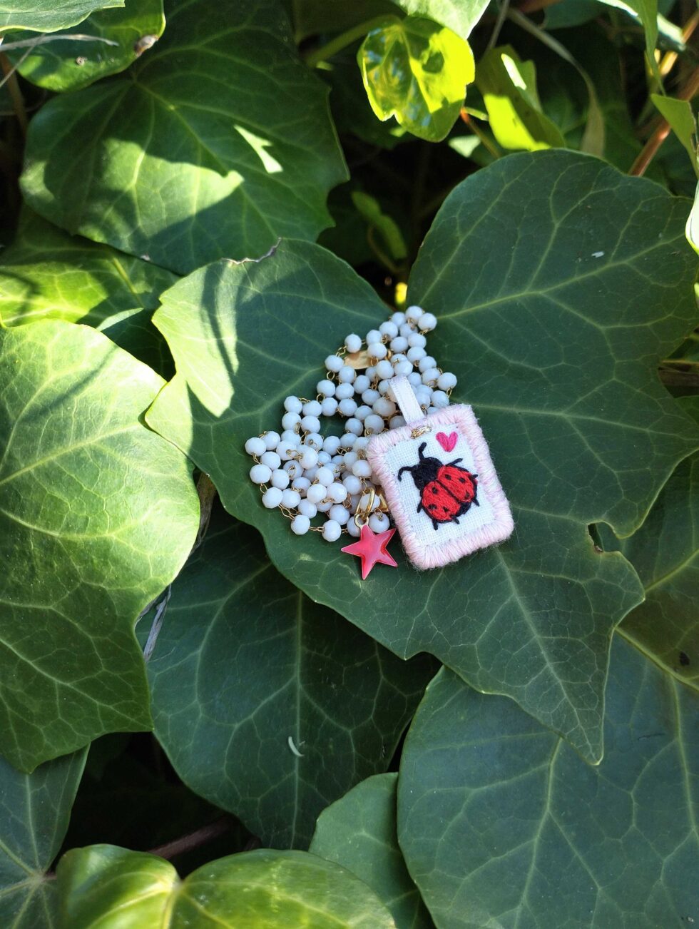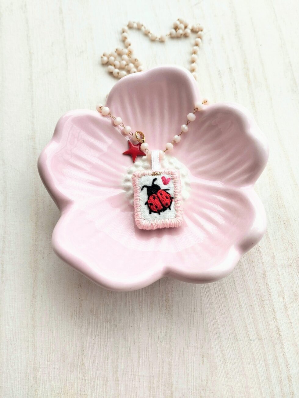 Medaglietta tessile centrale sagoma rettangolare ricamata a motivo di coccinella rossa e cuoricino rosa su base di cotone color bianco panna profilata nei toni pastello del rosa tenue (misure di circa 2 cm per 1 cm) con stellina smaltata sul lato.