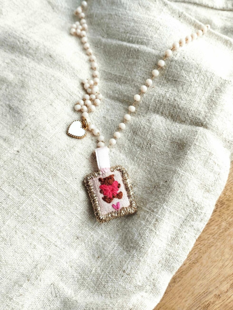 Medaglietta tessile centrale sagoma rettangolare ricamata a motivo orsetto con fiocco rosso lampone su base di cotone rosa pallido profilata in lurex oro (misure circa 2 cm per 1,5 cm).