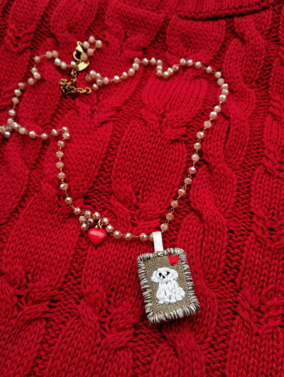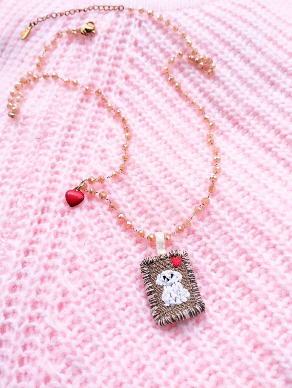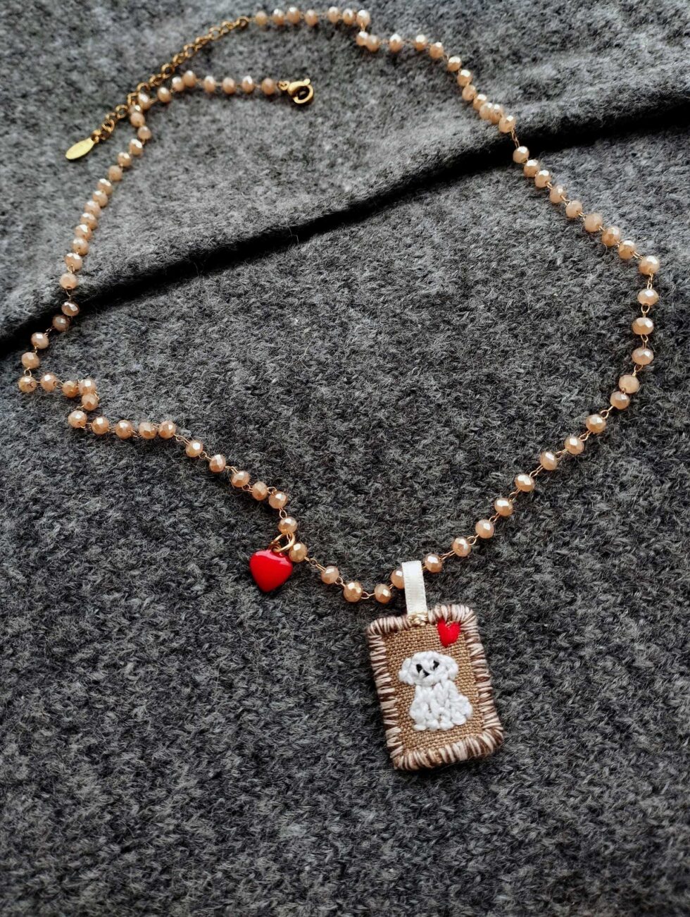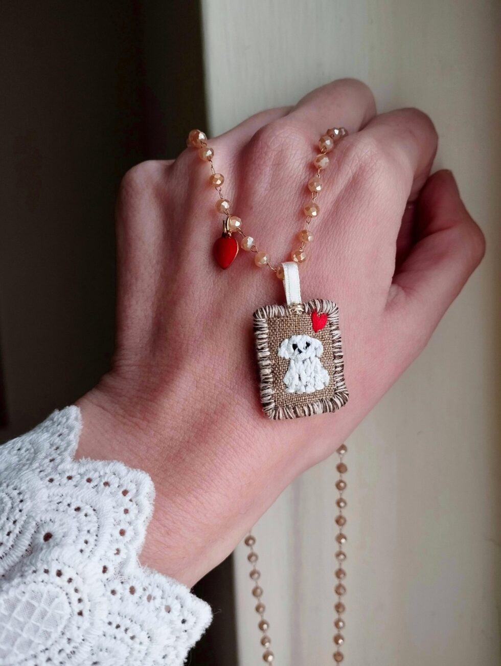 Medaglietta tessile centrale sagoma rettangolare ricamata a motivo di cagnolino bianco su base di lino color marroncino profilata nei delicati toni del bianco panna e marrone (misure di circa 2 cm per 1,5 cm) con charm cuoricino rosso in smalto sul lato.