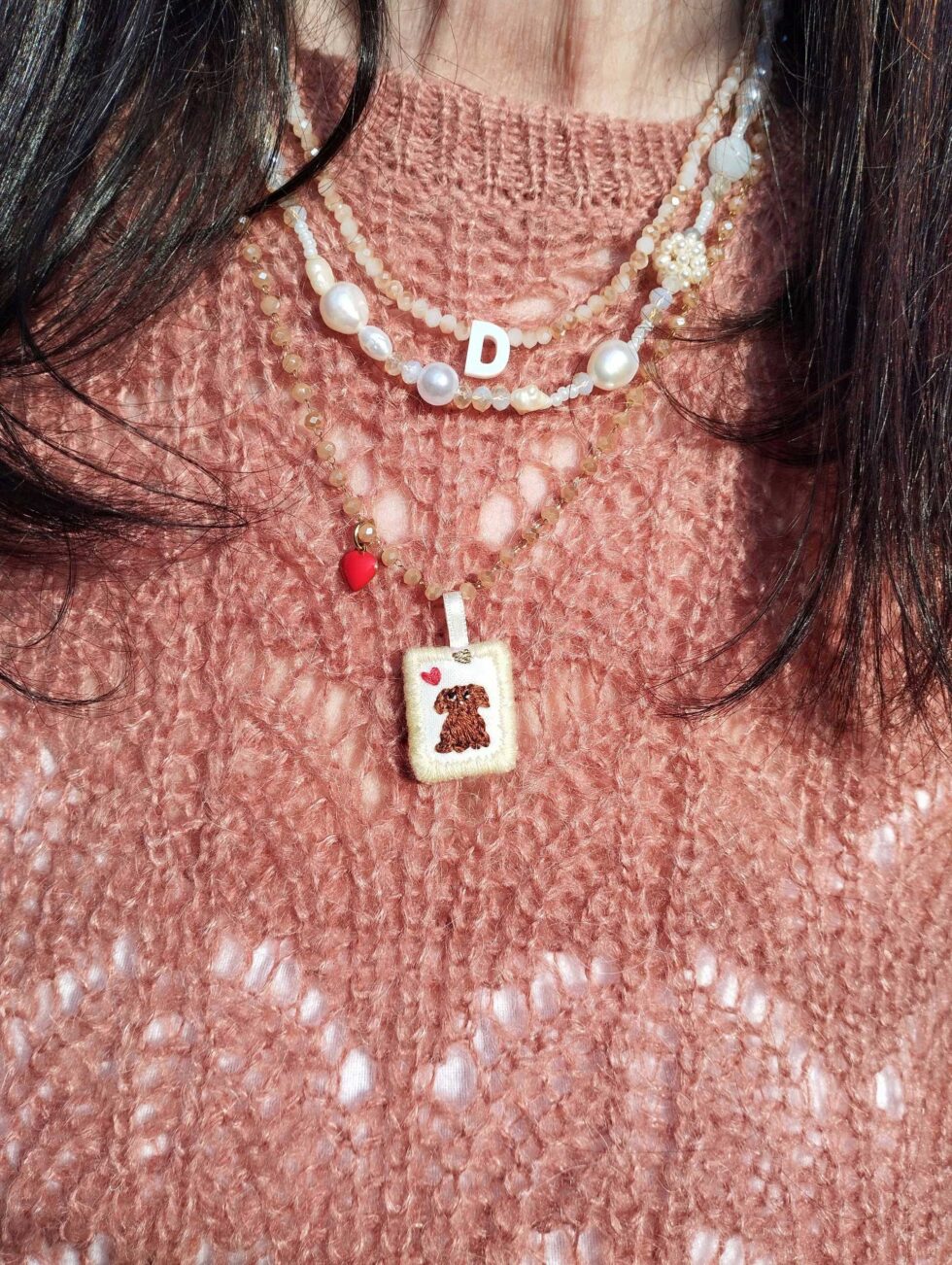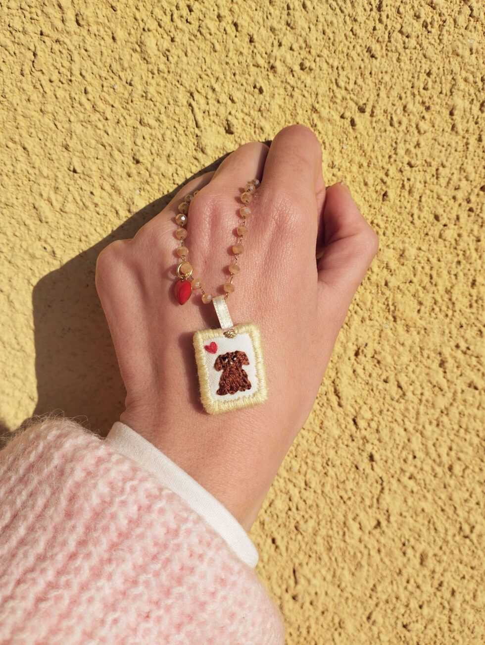 Medaglietta tessile centrale sagoma rettangolare ricamata a motivo di cagnolino marrone su base di cotone color bianco panna profilata nei delicati toni del giallo pastello (misure di circa 2 cm per 1,5 cm) con charm cuoricino rosso in smalto sul lato.