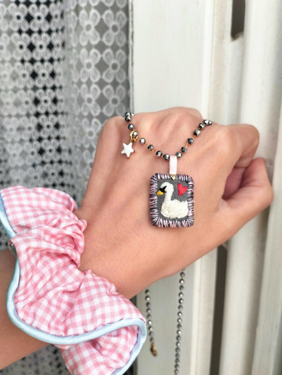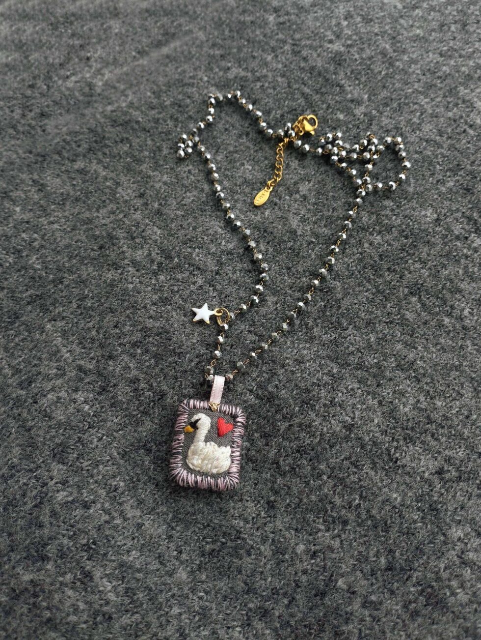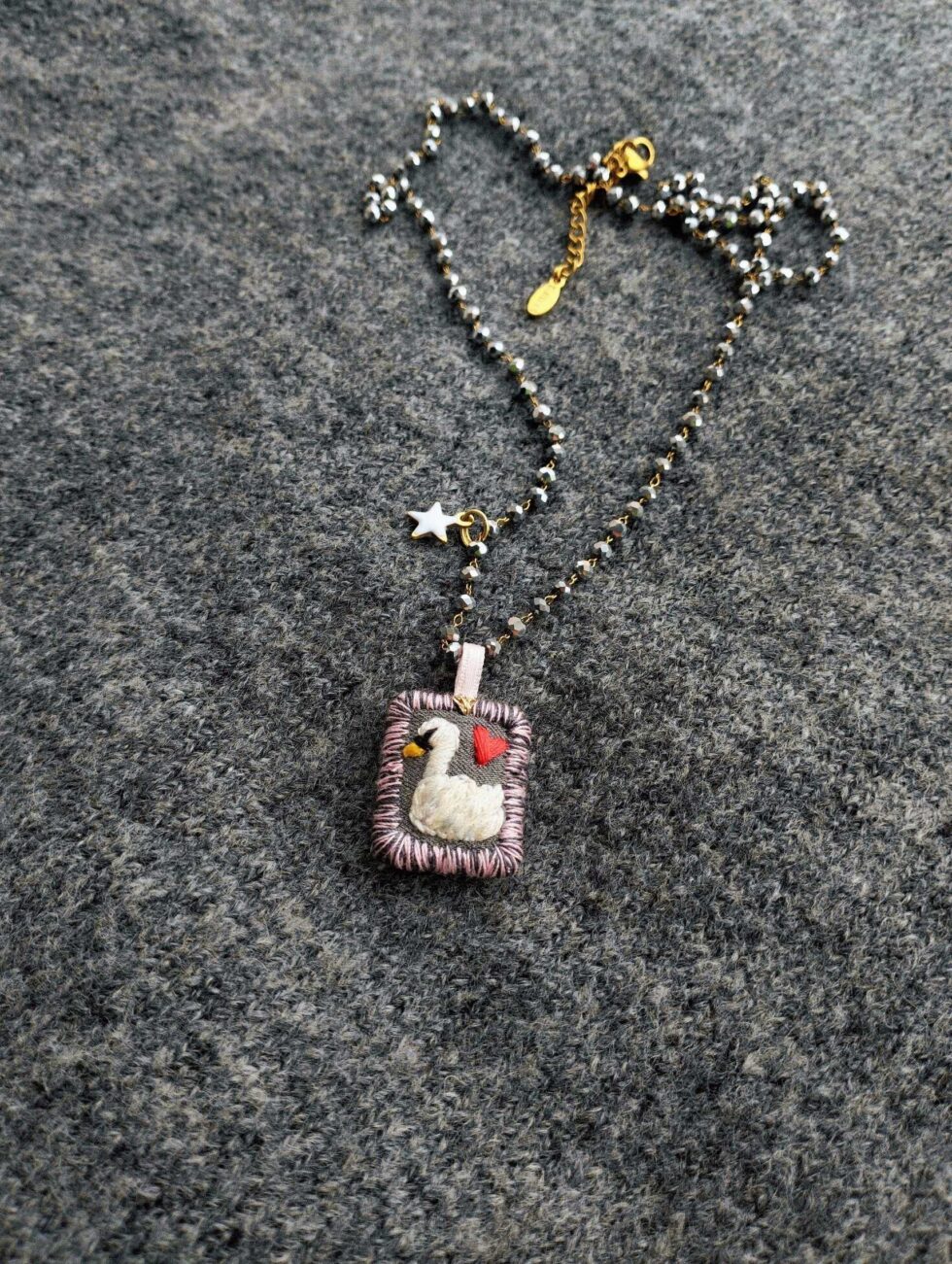Medaglietta tessile centrale sagoma rettangolare ricamata a motivo cigno su base di cotone grigio scura profilata nei delicati toni del rosa pastello e grigio dello stesso tono della base (misure circa 2 cm per 1,5 cm).