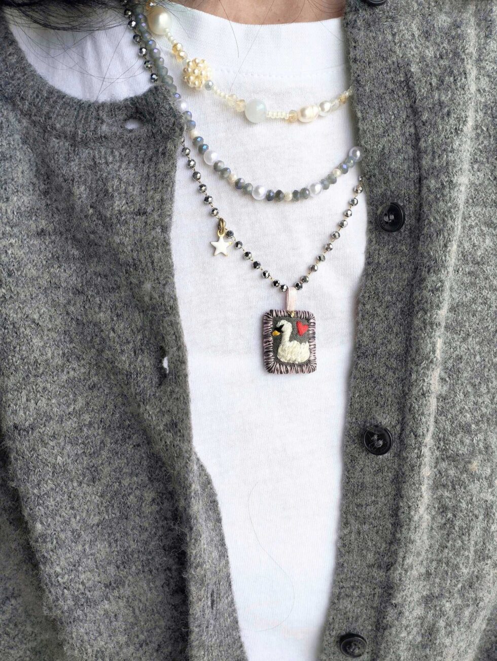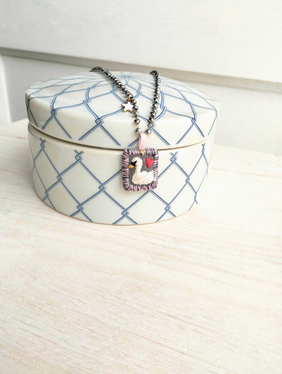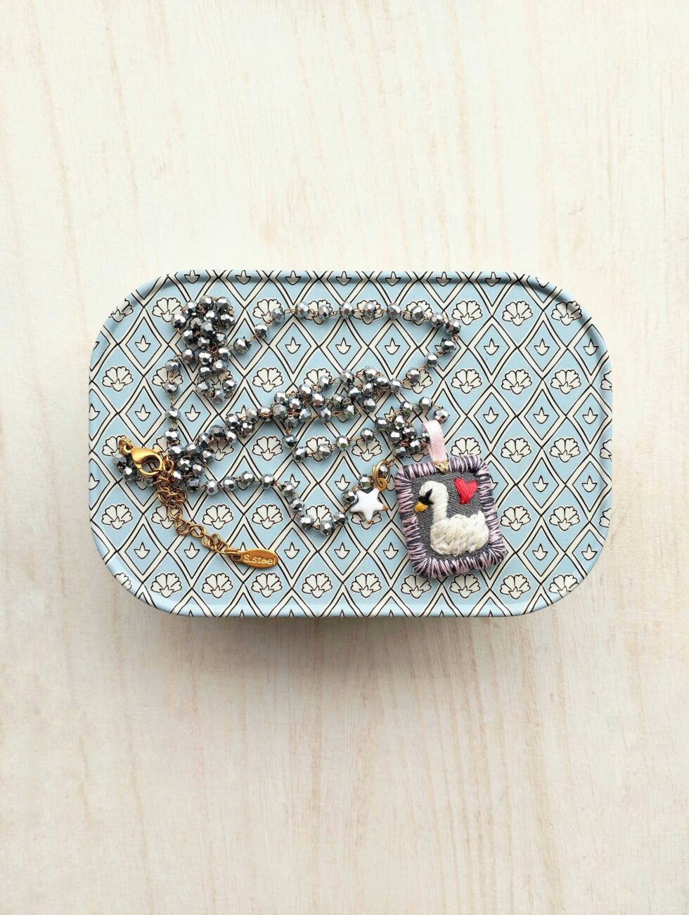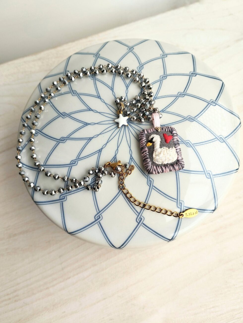 Medaglietta tessile centrale sagoma rettangolare ricamata a motivo cigno su base di cotone grigio scura profilata nei delicati toni del rosa pastello e grigio dello stesso tono della base (misure circa 2 cm per 1,5 cm).