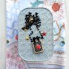 Medaglietta tessile centrale sagoma rettangolare ricamata a motivo cuore rosso su base di lana in tweed bianco e nero profilata in lurex oro (misure circa 2 cm per 1,5 cm).