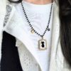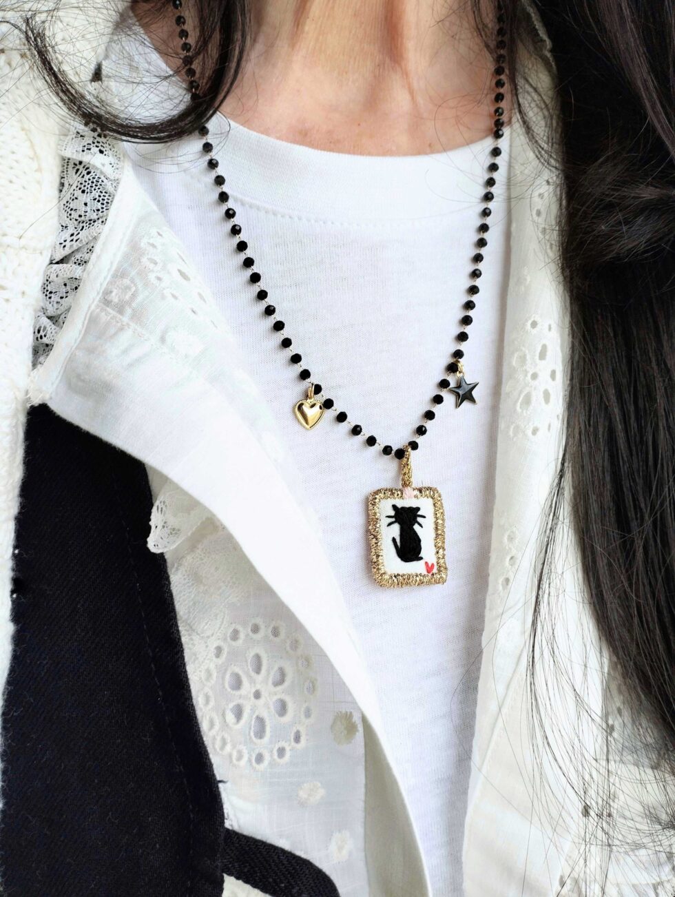 NB: nella prima della galleria, per esigenze dimostrative ed estetiche rispetto alla sequenza fotografica dello shop, la presente collana è stata proposta in abbinamento al rosario “Cuoricino” a base tweed bianco e nero ma si tratta di due collane distinte e vendute singolarmente e separatamente, NON di una collana a doppio giro e a doppio ciondolo tessile.
