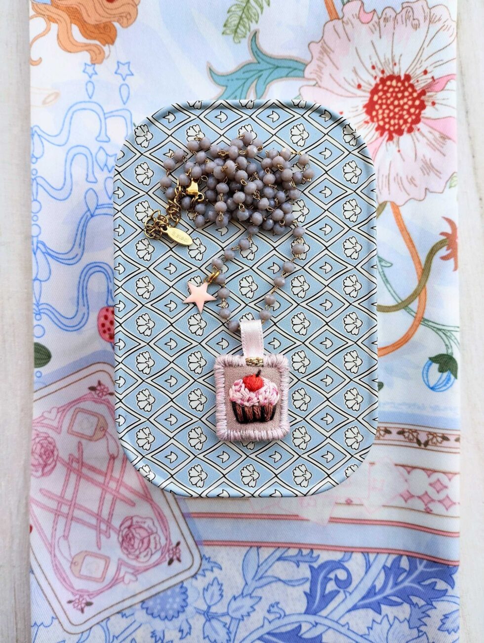 Medaglietta tessile centrale sagoma rettangolare ricamata a motivo pasticcino su base di cotone color tortora profilata nei delicati toni del rosa pastello e grigio chiaro (misure circa 2 cm per 1,5 cm).