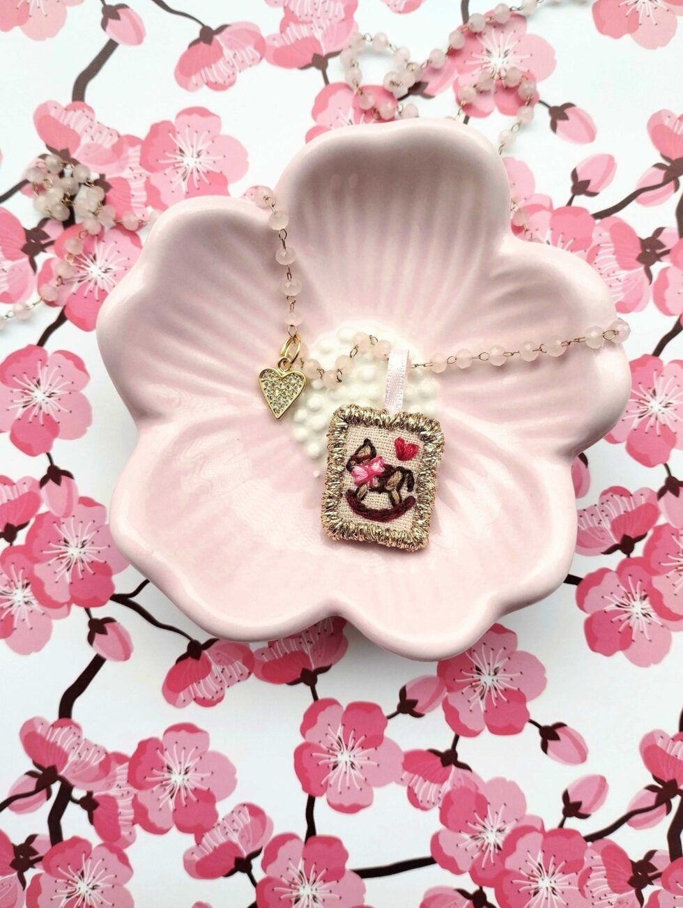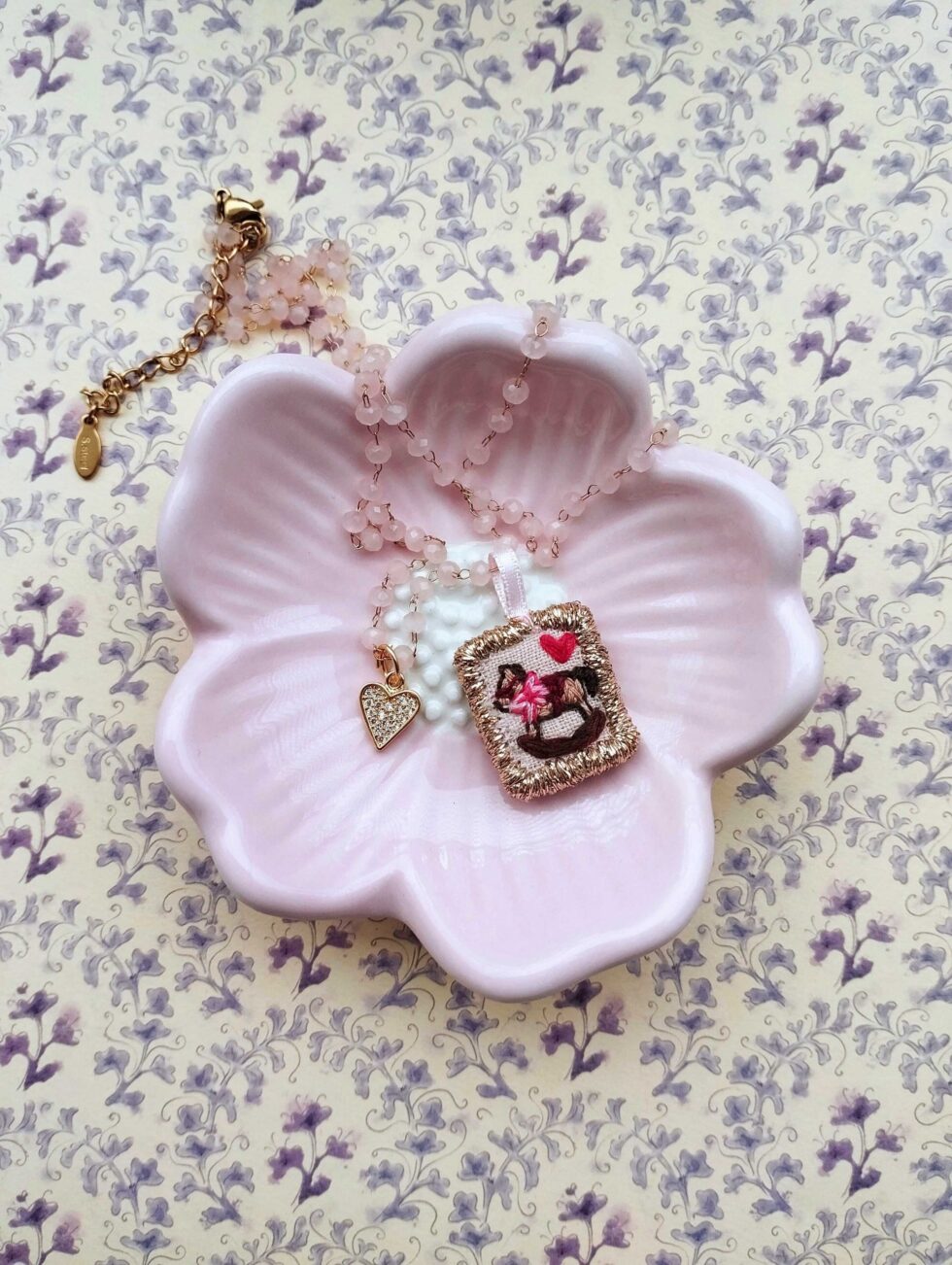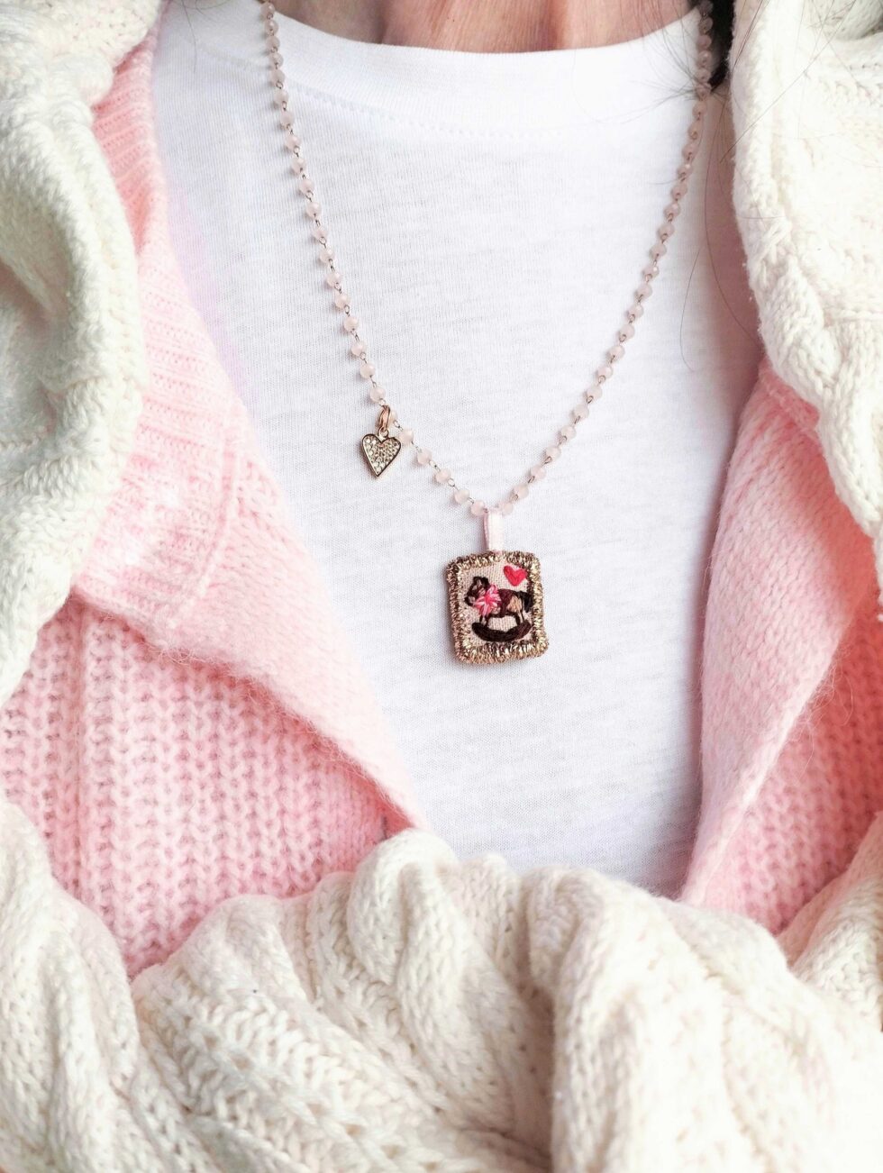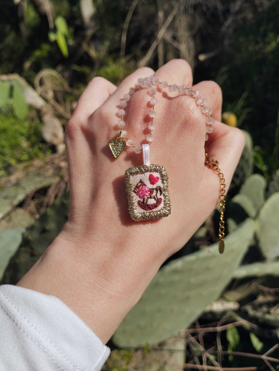 Medaglietta tessile centrale sagoma rettangolare ricamata a motivo di cavallino a dondolo e cuoricino rosso su base di lino color rosa chiaro profilata in lurex dorato (misure di circa 2 cm per 1,5 cm) con cuoricino zirconato sul lato.