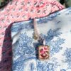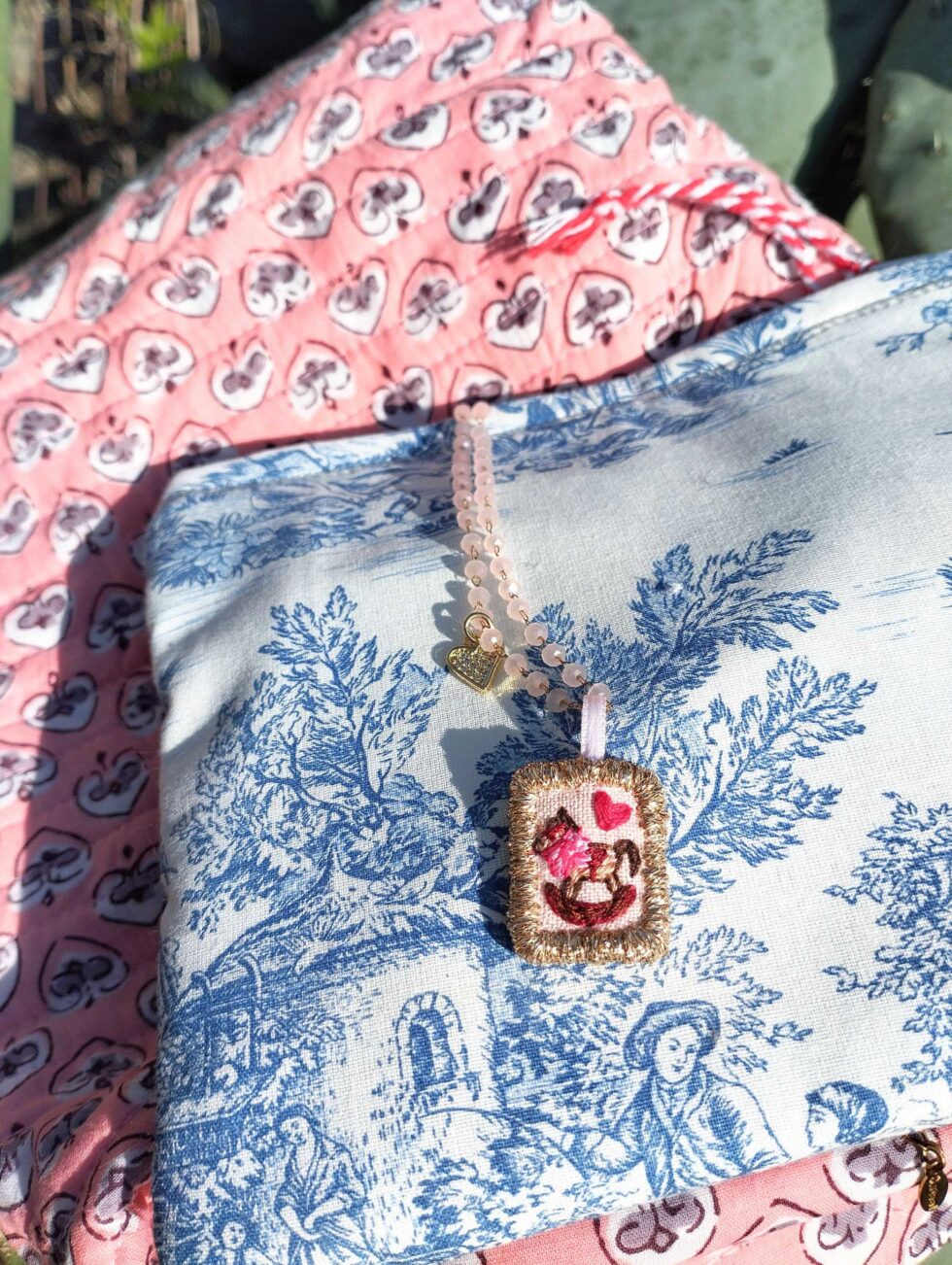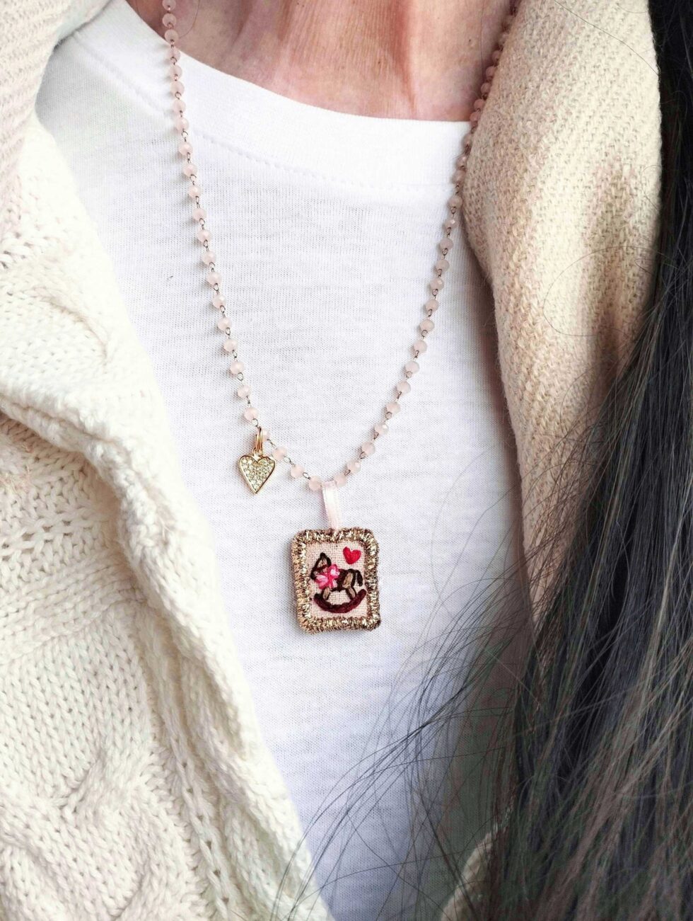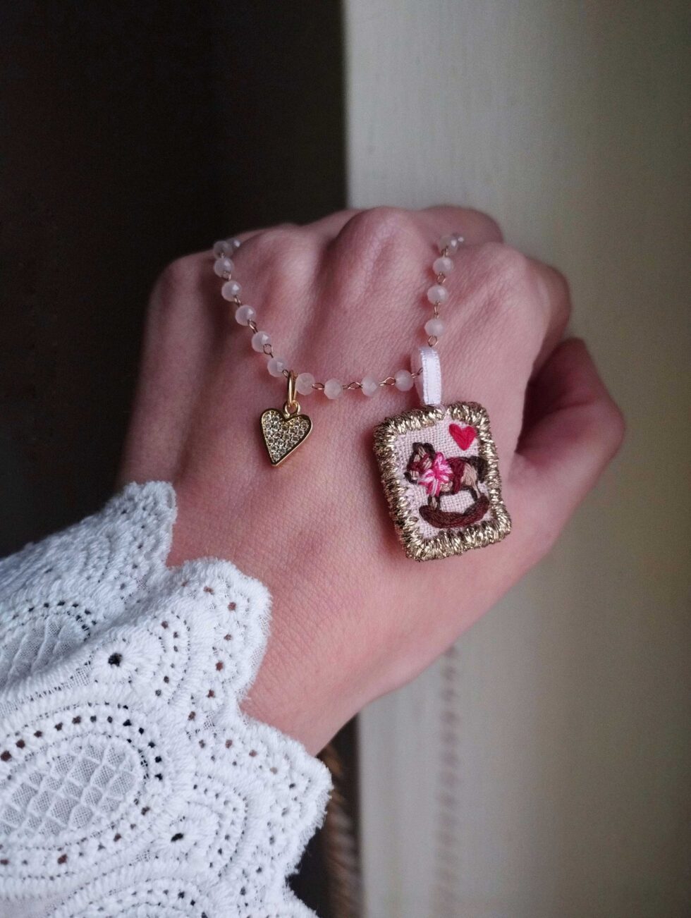 Medaglietta tessile centrale sagoma rettangolare ricamata a motivo di cavallino a dondolo e cuoricino rosso su base di lino color rosa chiaro profilata in lurex dorato (misure di circa 2 cm per 1,5 cm) con cuoricino zirconato sul lato.